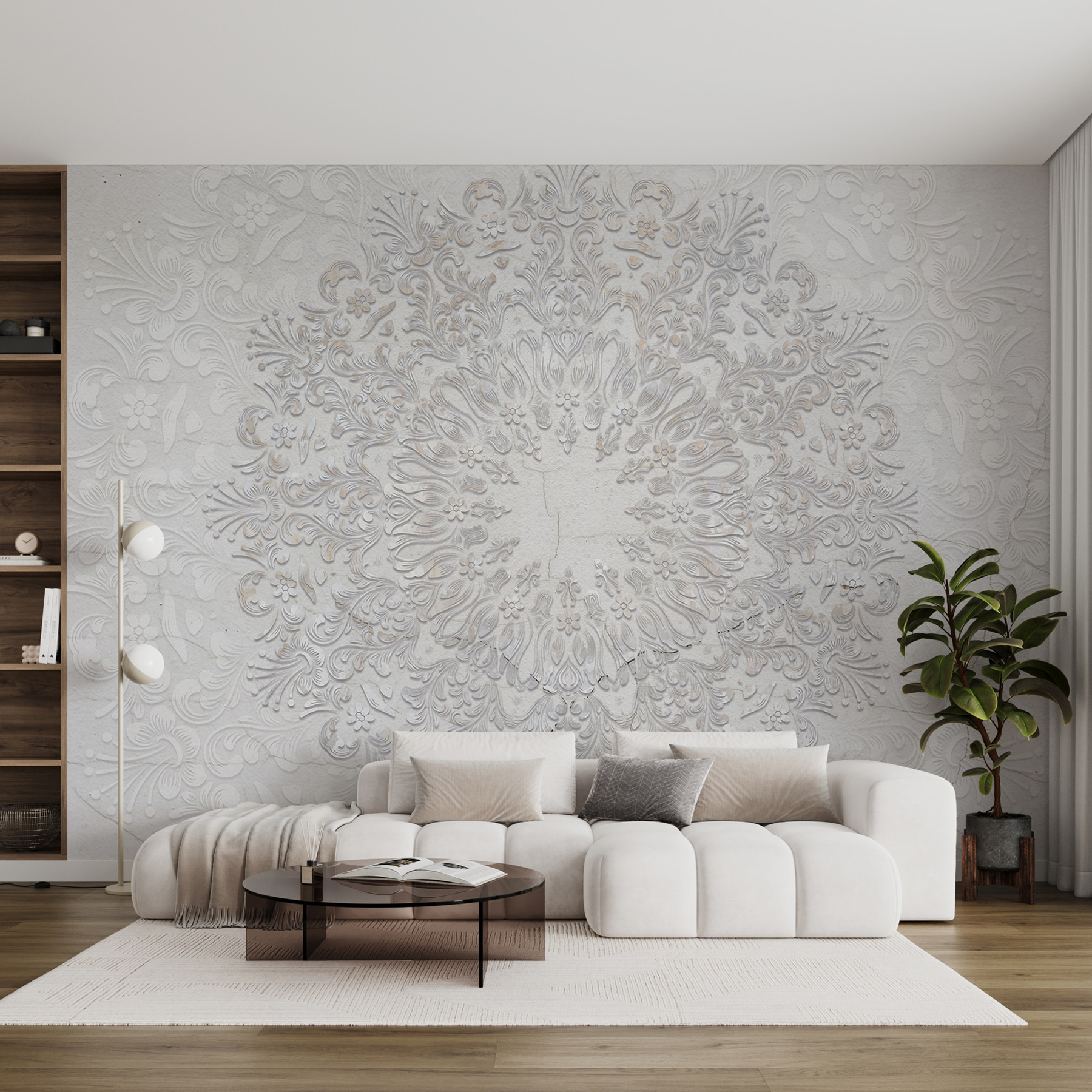 Φανταστείτε να φέρετε λίγη επιπλέον κομψότητα στο χώρο σας με αυτή την εκπληκτική τοιχογραφία. Το λευκό φλοράλ σχέδιο σε τραγανό λευκό φόντο είναι σαν να έχετε ένα απαλό, περίπλοκο σχέδιο δαντέλας να κοσμεί τους τοίχους σας. Είναι ιδανικό για όσους εκτιμούν την ομορφιά των λεπτών λεπτομερειών και θέλουν να προσθέσουν μια πινελιά φινέτσας χωρίς να κατακλύζουν ένα δωμάτιο.