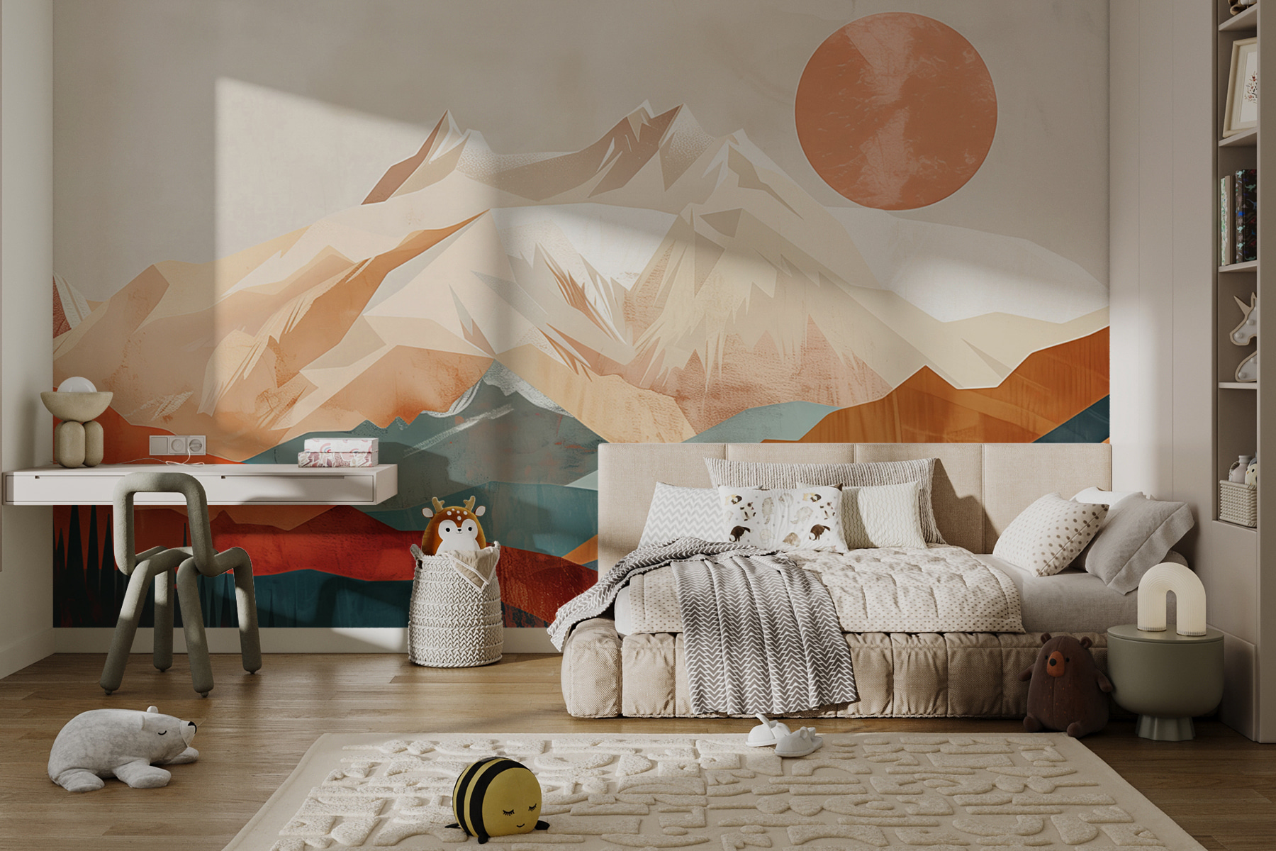Ευχηθήκατε ποτέ να μπορούσατε να ξυπνάτε με θέα στο βουνό κάθε μέρα; Λοιπόν, το “Ταπετσαρίες w01358” σας έχει καλύψει! Είναι σαν να μπαίνεις σε ένα αφηρημένο όνειρο -τολμηρές κορυφές που μοιάζουν να αγγίζουν τον ουρανό, ένας ζεστός ήλιος που αιωρείται σε έναν θολό, γαλήνιο ουρανό… Και μόνο που το κοιτάζετε μπορεί να σας κάνει να νιώσετε σαν να βρίσκεστε σε μίνι διακοπές. Ιδανικό για όποιον αγαπάει τη φύση αλλά θέλει αυτή τη σύγχρονη, καλλιτεχνική ατμόσφαιρα. Φανταστείτε το στο σαλόνι σας ή ακόμα και στο γραφείο σας – φέρνει την ύπαιθρο στο εσωτερικό με έναν τόσο κομψό, ηρεμιστικό τρόπο. Ιδανικό για τη δημιουργία ενός εμπνευσμένου χώρου με θέα… χωρίς όλα τα ταξίδια!