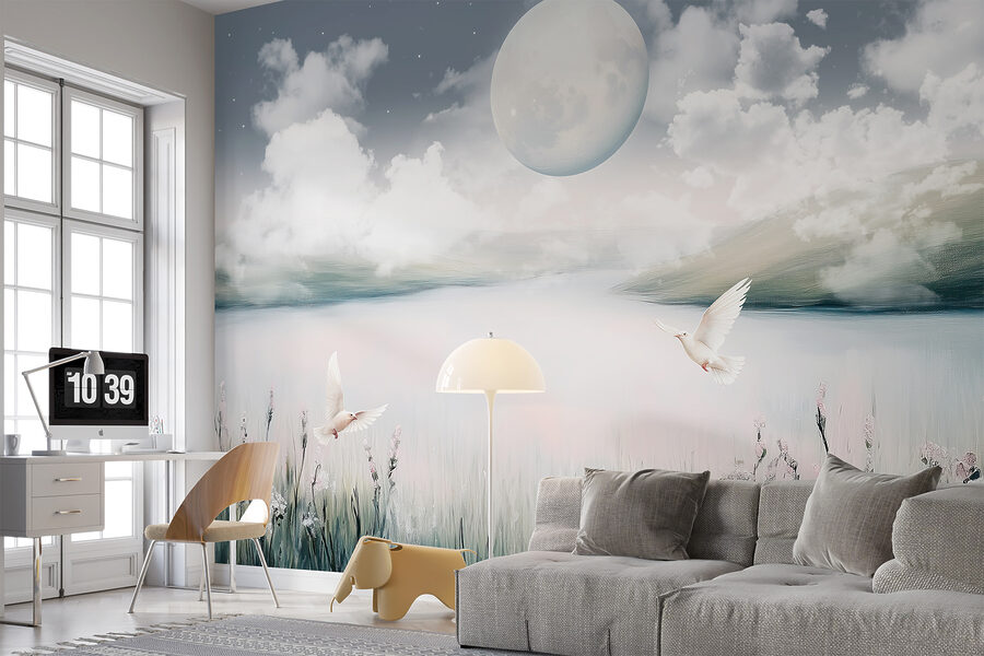 Φανταστείτε να χαλαρώνετε στον καναπέ σας, με ένα φλιτζάνι τσάι στο χέρι, και να αισθάνεστε σαν να αιωρείστε σε αυτό το γαλήνιο τοπίο. Τα πρωινά νιώθετε γαλήνια, τα βράδια απόλυτα μαγικά. Είναι ιδανικό για όποιον αγαπάει τη φύση και θέλει ένα άγγιγμα του αλλόκοτου. Μπόνους; Αυτά τα παστέλ λουλούδια και τα πουλιά προσθέτουν ακριβώς τη σωστή πινελιά γοητείας χωρίς να είναι υπερβολικά υπερβολικά. Σίγουρα θα προκαλέσει συζήτηση στο επόμενο οικογενειακό δείπνο! 🌙✨