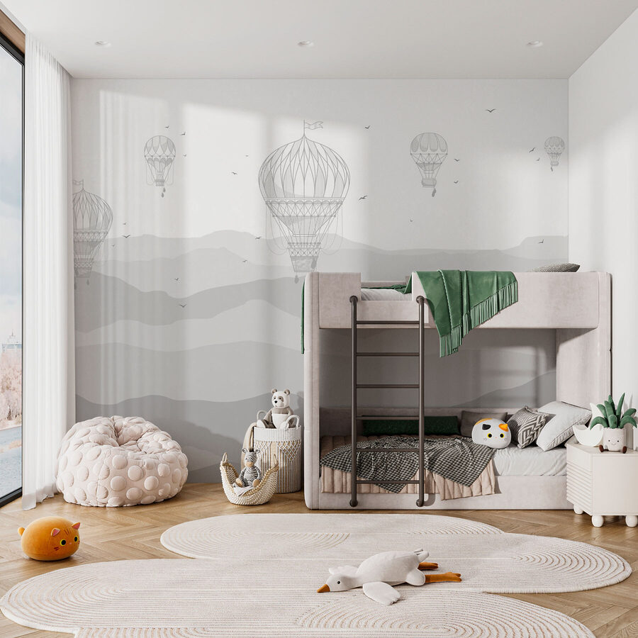 Τα απαλά βουνά σε κλίμακα του γκρι και τα αέρινα μπαλόνια φέρνουν σχεδόν ένα απαλό αεράκι στο μυαλό – δεν μπορείτε να το νιώσετε; Ίσως πίνετε τον πρωινό σας καφέ ή χαλαρώνετε μετά από μια κουραστική μέρα, ρίχνοντας μια ματιά σε αυτή την τοιχογραφία… και ξαφνικά βρίσκεστε στα 10.000 πόδια ψηλά, παρασυρόμενοι ανάμεσα στα σύννεφα. Δεν είναι απλώς διακόσμηση τοίχου, είναι μια ολόκληρη ατμόσφαιρα – ευγενική, ονειρική και ελαφρώς μαγική… ακριβώς αυτό που δεν ήξερες ότι χρειαζόταν ο χώρος σου!
