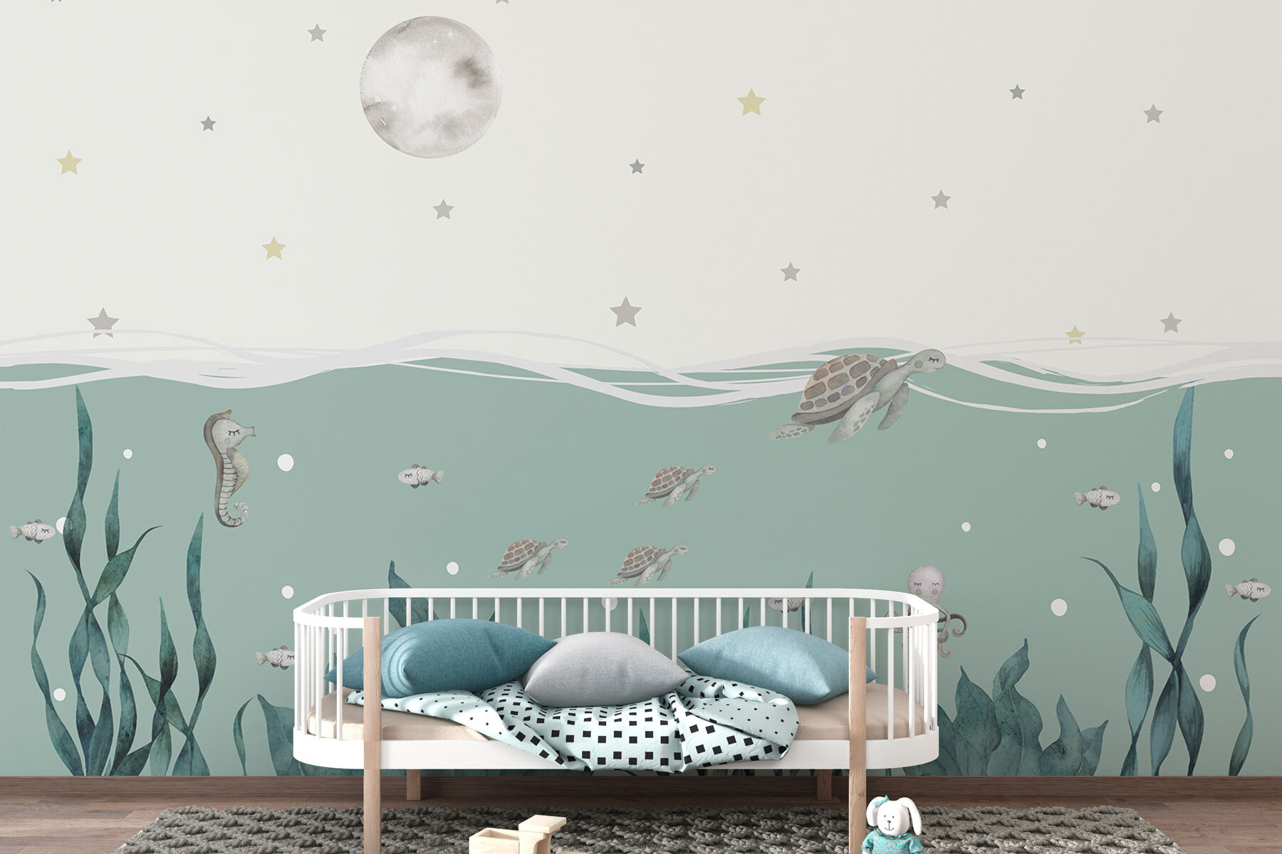 Φανταστείτε να βυθίζεστε σε έναν γαλήνιο υποβρύχιο κόσμο κάθε φορά που μπαίνετε στο δωμάτιο. Αυτή η τοιχογραφία “Seaweed & Seahorses” αποτυπώνει τον απαλό χορό των θαλάσσιων πλασμάτων κάτω από έναν έναστρο νυχτερινό ουρανό. Είναι σαν οι τοίχοι σας να έκαναν μια απολαυστική βουτιά στον ωκεανό. Ιδανική για κάθε χώρο που χρειάζεται μια πινελιά ιδιοτροπίας ή μια ηρεμιστική ατμόσφαιρα. Επιπλέον, ποιος δεν θέλει να βλέπει μικροσκοπικές χελώνες να γλιστρούν δίπλα σας ενώ πίνετε τον πρωινό σας καφέ; Προχωρήστε – προσθέστε μια βουτιά θάλασσας στη διακόσμησή σας και αφήστε τη φαντασία σας να κολυμπήσει ελεύθερα!