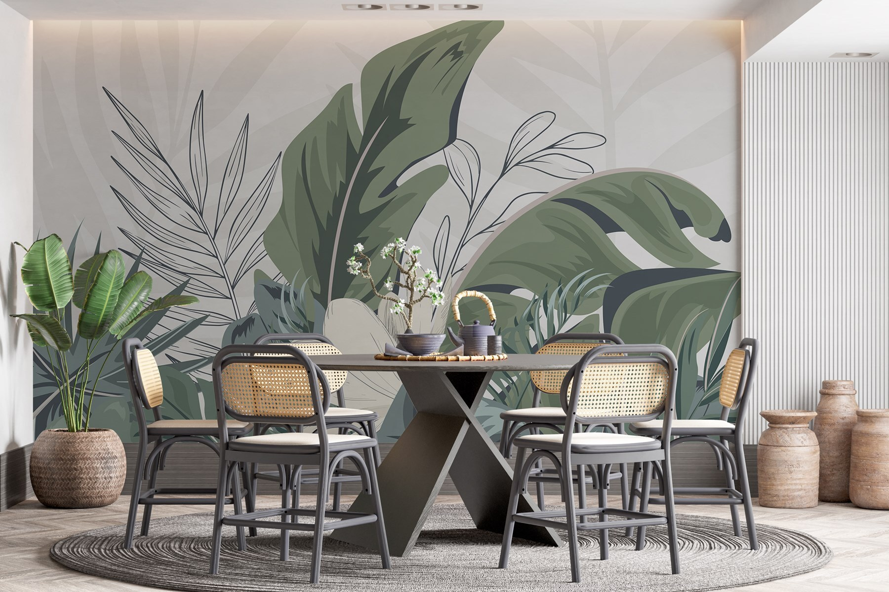 Μεταμορφώστε οποιονδήποτε χώρο σε ένα γαλήνιο καταφύγιο με αυτή την εκπληκτική τοιχογραφία τοίχου, “Φυσικό φύλλωμα σε αρμονία και ισορροπία”. Φανταστείτε να μπαίνετε κάθε πρωί σε έναν καταπράσινο παράδεισο, όπου τα ζωντανά πράσινα και οι απαλές υφές σας προσκαλούν να χαλαρώσετε. Αυτή η τοιχογραφία συνδυάζει τέλεια τις τροπικές δονήσεις με μια ηρεμιστική αισθητική, καθιστώντας την ένα φανταστικό σκηνικό για ήσυχα βράδια ή ζωηρές συγκεντρώσεις. Φανταστείτε να πίνετε καφέ ενώ περιβάλλεστε από την ομορφιά της φύσης ή να φιλοξενείτε φίλους σε ένα περιβάλλον που μοιάζει με όαση. Είναι σαν να προσκαλείτε ένα κομμάτι από την ύπαιθρο στο σπίτι σας – χωρίς τα ζωύφια! Ιδανικό για σαλόνια, υπνοδωμάτια ή ακόμη και για δημιουργικούς χώρους, είναι βέβαιο ότι θα προκαλέσει χαρά και λίγη ζήλια στους καλεσμένους. Ισορροπία, αρμονία και ένα άγγιγμα φύσης – τι περισσότερο θα μπορούσε να ζητήσει κανείς;