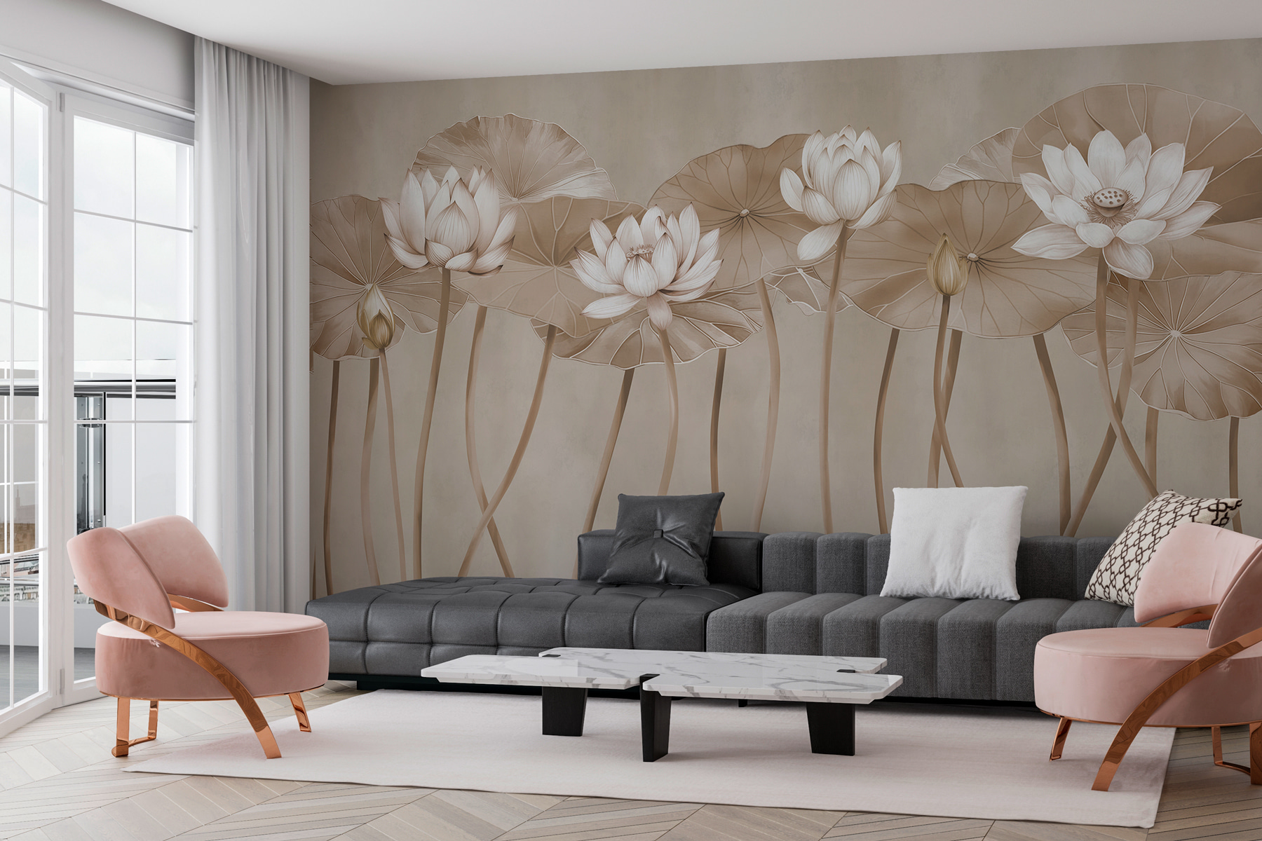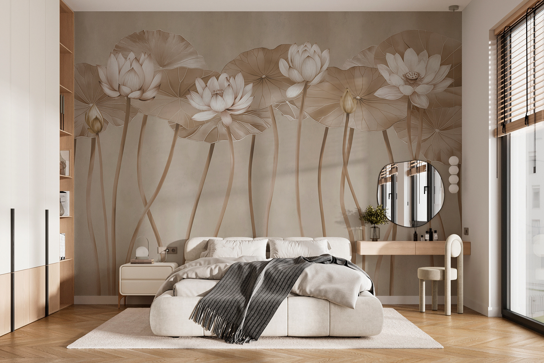 Μεταμορφώστε έναν απλό τοίχο σε μια γαλήνια απόδραση με την τοιχογραφία Ethereal Lotus σε μονόχρωμες αποχρώσεις. Φανταστείτε να μπαίνετε σε έναν ήσυχο κήπο, όπου τα ντελικάτα λουλούδια λωτού λικνίζονται απαλά στους ψηλούς μίσχους τους. Αυτή η τοιχογραφία φέρνει ένα άγγιγμα της φύσης στους εσωτερικούς χώρους, δημιουργώντας μια ηρεμιστική ατμόσφαιρα που ψιθυρίζει: “Πάρε μια ανάσα, είσαι σπίτι”. Ιδανικό για κάθε χώρο που χρειάζεται λίγη γοητεία, μπορεί να πυροδοτήσει συζητήσεις ή απλά να προσφέρει ένα ειρηνικό σκηνικό ενώ πίνετε τον πρωινό καφέ σας. Είναι σαν να έχετε μια μίνι όαση ακριβώς εκεί που τη χρειάζεστε. Επιπλέον, ποιος δεν αγαπάει μια καλή στιγμή με λουλούδια λωτού;