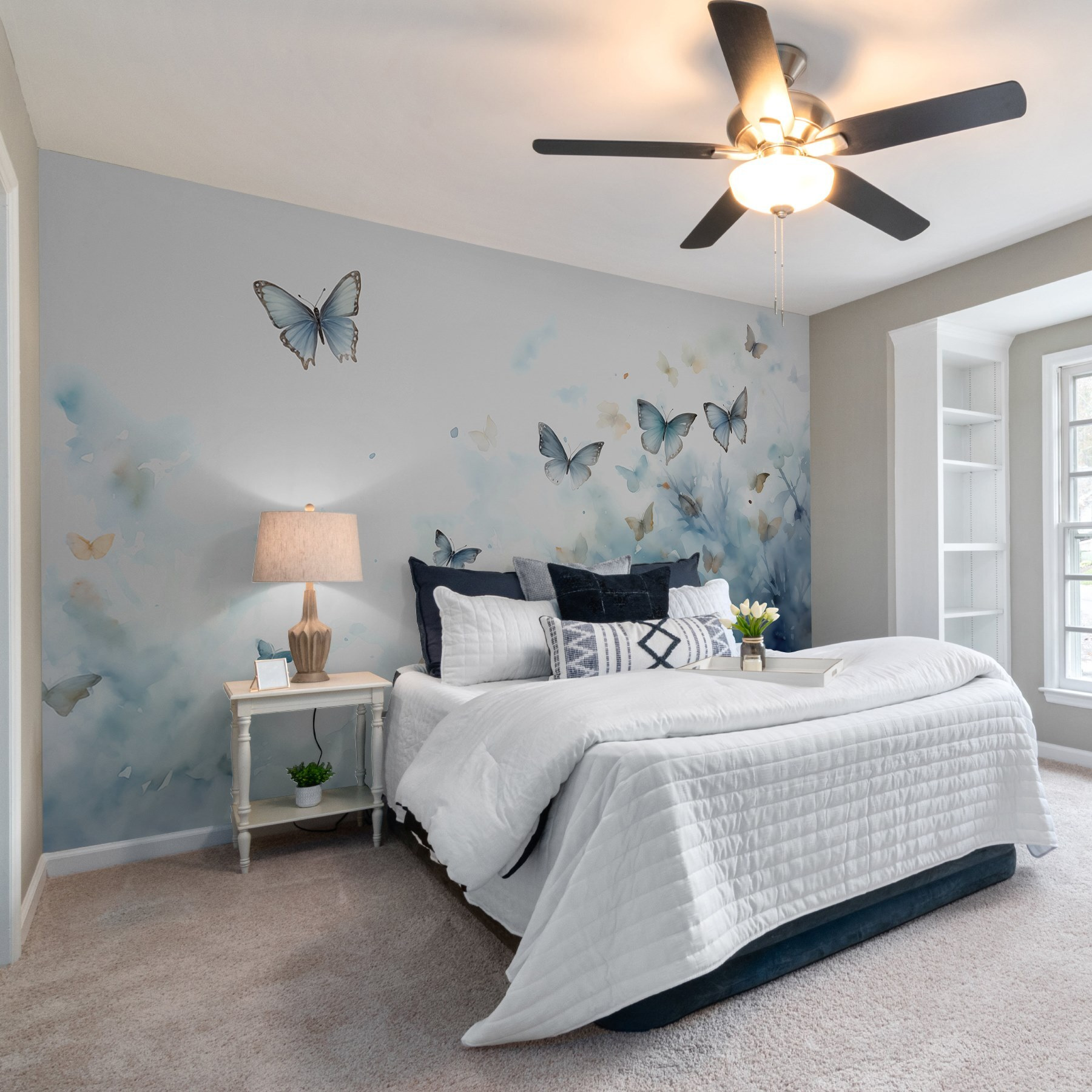 Φανταστείτε να μπαίνετε σε έναν κόσμο όπου οι πεταλούδες χορεύουν με χάρη σε έναν ουρανό με νερομπογιές – ακούγεται ονειρικό, σωστά; Αυτή η τοιχογραφία φέρνει ακριβώς αυτή την ατμόσφαιρα στο χώρο σας. Είναι σαν να έχετε ένα κομμάτι της τέχνης της φύσης μέσα στο σπίτι. Τα απαλά μπλε χρώματα και τα απαλά φτερουγίσματα δημιουργούν μια ήρεμη, μαγευτική ατμόσφαιρα. Ιδανική για εκείνες τις στιγμές που απλά θέλετε να καθίσετε και να αφήσετε το μυαλό σας να περιπλανηθεί. Φανταστείτε ένα βροχερό απόγευμα, με ένα φλιτζάνι τσάι στο χέρι και αυτές τις πεταλούδες να προσθέτουν μια πινελιά μαγείας. Είναι σαν ένα όνειρο της ημέρας, ακριβώς στον τοίχο σας.