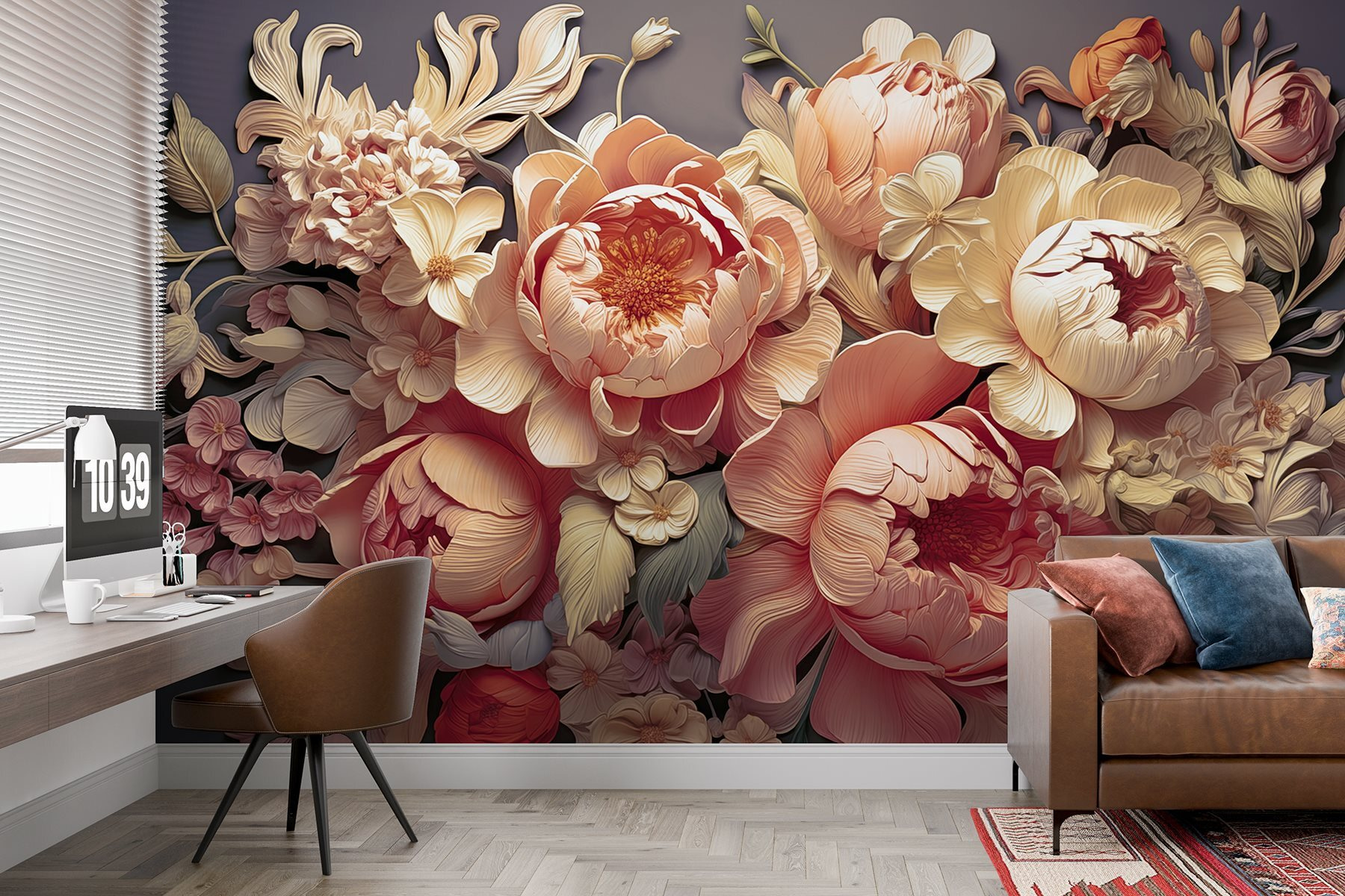 Φανταστείτε να μπαίνετε σε έναν χώρο όπου οι ζωντανές παιώνιες ανθίζουν στους τοίχους, σαν ένα αιώνιο πάρτι στον κήπο. Αυτή η τοιχογραφία, με το απαλό γκρι φόντο της, αναδεικνύει τέλεια τα ζωηρά χρώματα των λουλουδιών, κάνοντας τον χώρο να μοιάζει φρέσκος και φιλόξενος. Είναι σαν μια ανάσα άνοιξης, ανεξάρτητα από την εποχή που επικρατεί έξω.