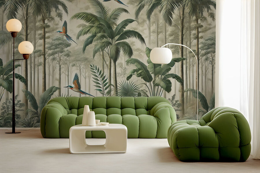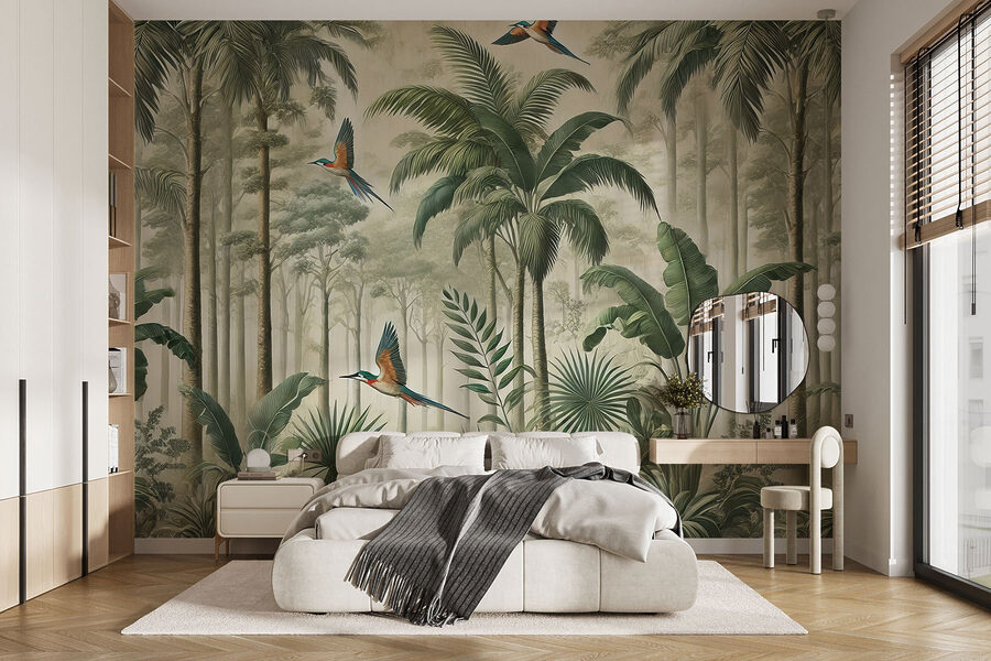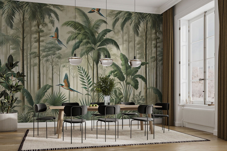 Μεταμορφώστε οποιοδήποτε δωμάτιο σε μια ήρεμη απόδραση με αυτή την εκπληκτική τοιχογραφία πουλιών που πετούν πάνω από ένα καταπράσινο δάσος. Φανταστείτε να μπαίνετε μέσα και να αισθάνεστε σαν να βρίσκεστε σε μια γαλήνια ζούγκλα, όπου τα ζωντανά χρώματα ξεπηδούν και ο αέρας είναι πλούσιος με το άρωμα των τροπικών φυλλωμάτων. Το παιχνιδιάρικο πέταγμα των πουλιών προσθέτει μια πινελιά ιδιοτροπίας, φωτίζοντας ακόμα και τους πιο βαρετούς χώρους. Ιδανική για τη δημιουργία μιας άνετης γωνιάς ανάγνωσης ή ενός ήρεμου καταφυγίου, αυτή η τοιχογραφία ψιθυρίζει απαλά την περιπέτεια και την ηρεμία. Ιδανικό για όσους αγαπούν τη φύση ή απλά χρειάζονται μια μικρή απόδραση από την καθημερινή φασαρία -γιατί ποιος δεν θέλει να νιώθει σαν να βρίσκεται σε μια τροπική απόδραση; Αφήστε λοιπόν τους τοίχους σας να τραγουδήσουν και ανεβάστε τον χώρο σας!