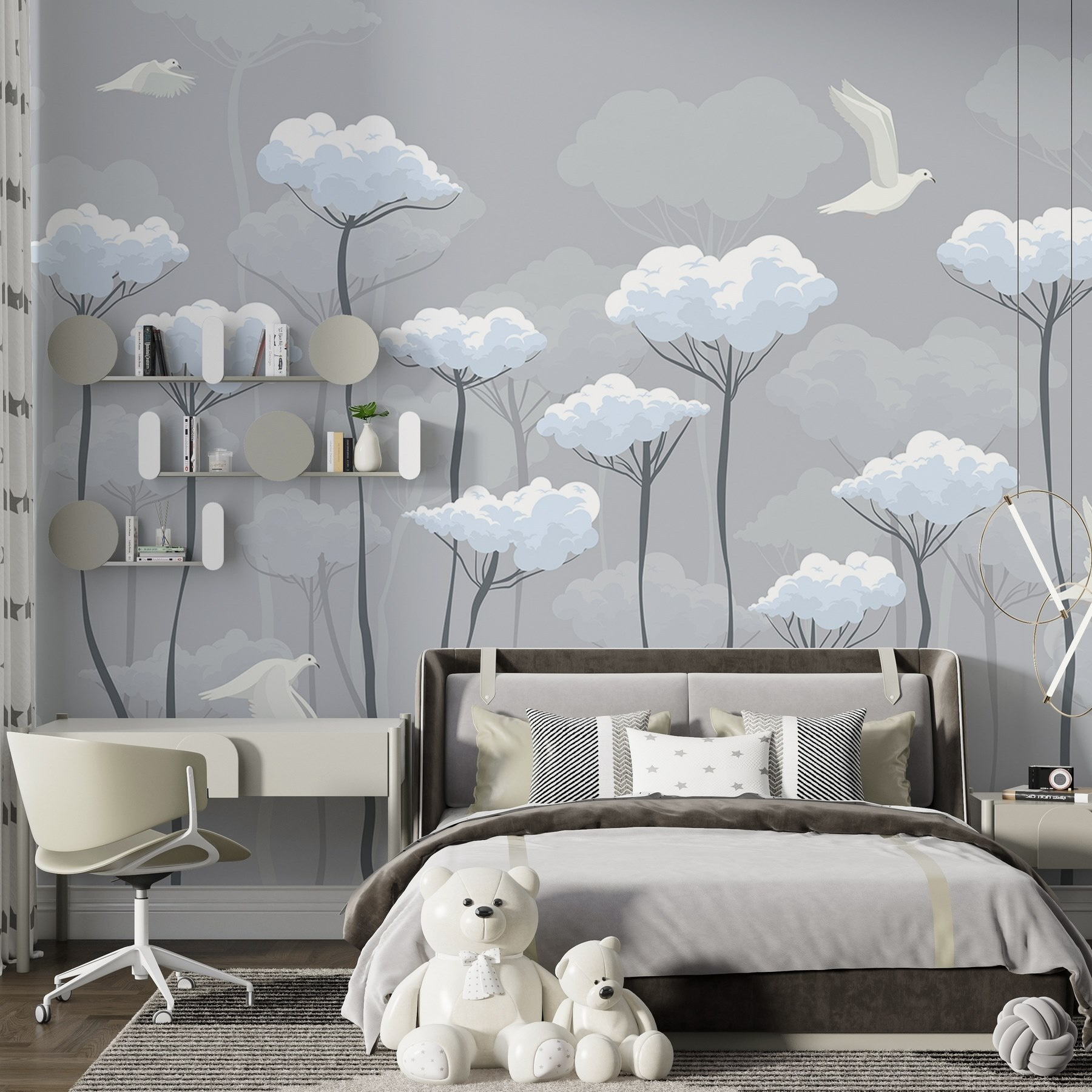 Φανταστείτε να μπαίνετε σε ένα δωμάτιο όπου απαλά σύννεφα φιλούν τον ουρανό και πουλιά γλιστρούν με χάρη στον αέρα. Αυτή η εκπληκτική τοιχογραφία τοίχου, “Πουλιά που πετούν στα σύννεφα”, μεταμορφώνει έναν συνηθισμένο χώρο σε μια ονειρική απόδραση. Φανταστείτε το: χαλαρά πρωινά με καφέ, απολαμβάνοντας το φυσικό φως, με αυτά τα κομψά πουλιά να προσκαλούν μια αίσθηση γαλήνης και ηρεμίας. Οι απαλές αποχρώσεις του γκρι και του λευκού δημιουργούν μια φρέσκια, ευάερη ατμόσφαιρα – ιδανική για σαλόνια ή άνετες γωνιές ανάγνωσης. Είναι σαν να έχετε ένα κομμάτι του ουρανού στον τοίχο σας! Επιπλέον, ποιος δεν θα ήθελε μια μικρή υπενθύμιση της φύσης στους εσωτερικούς χώρους; Εύκολο στην εγκατάσταση και ευχάριστο στο να το θαυμάζετε, φέρνει μια πινελιά ιδιοτροπίας που γαργαλάει την καρδιά.