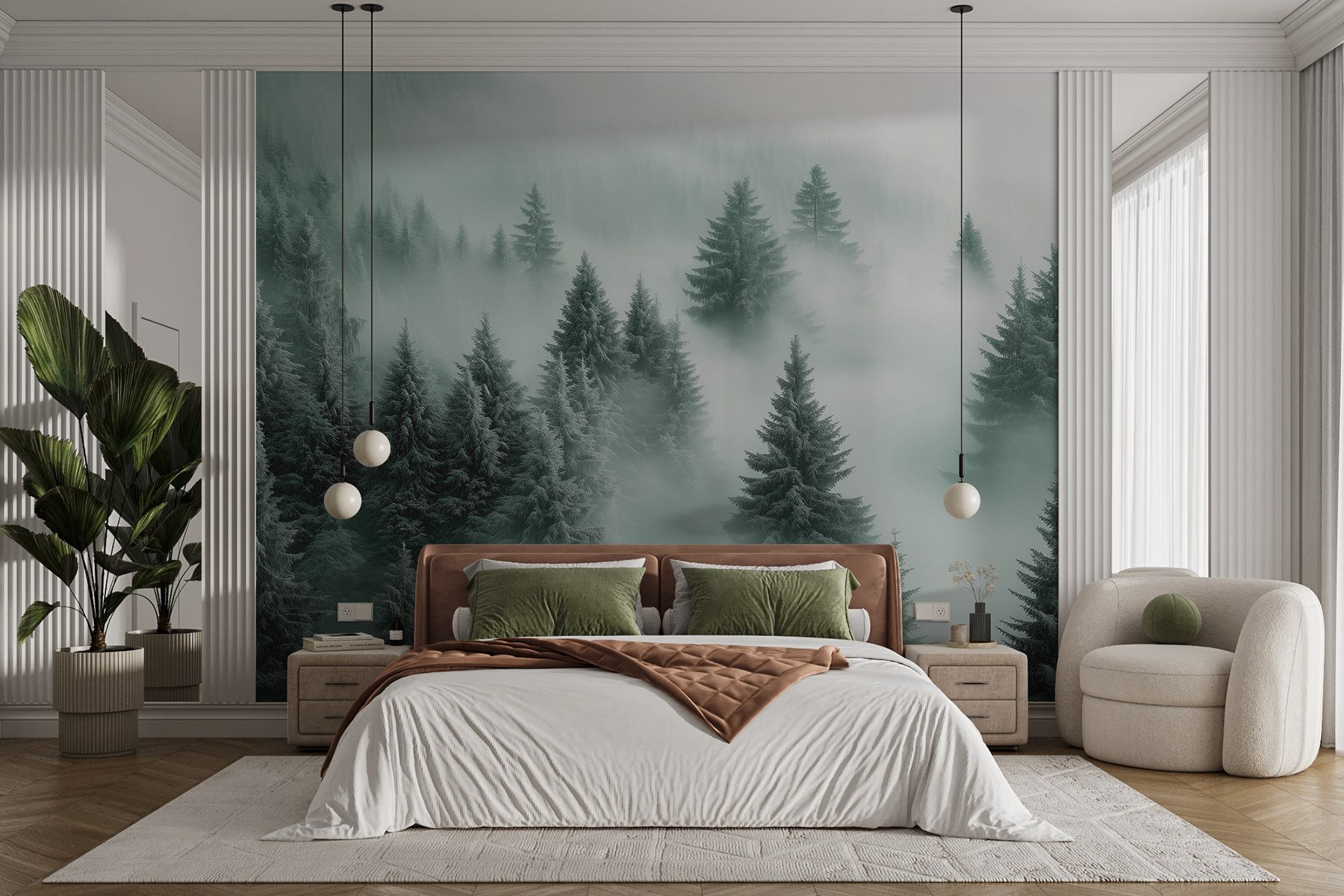 Φανταστείτε να μπαίνετε σε μια ζεστή και φιλόξενη καμπίνα και μετά – μπαμ! – να σας υποδέχεται αυτή η εκπληκτική τοιχογραφία με δέντρα στην ομίχλη. Είναι σαν να φέρνετε τη φύση στο σαλόνι σας, αλλά χωρίς τον κίνδυνο να σας χαλάσει το πάρτι ένας σκίουρος. Τα απαλά πράσινα χρώματα και η ομίχλη κάνουν τα πάντα να μοιάζουν ήρεμα και γαλήνια, ιδανικά για τις τεμπέλικες Κυριακές ή μετά από μια κουραστική μέρα. Φανταστείτε να χαλαρώνετε με ένα καλό βιβλίο, το τέλειο φλιτζάνι τσάι στο χέρι και να χάνεστε σε αυτό το ονειρικό τοπίο. Είναι έναυσμα για συζήτηση – οι επισκέπτες θα γοητευτούν. Είναι αυτό ένα μαγικό δάσος; Μια μυστική πύλη; Εσείς αποφασίζετε. Προσθέτοντας αυτή την τοιχογραφία είναι σαν να μοιράζεστε ένα μικρό κομμάτι ηρεμίας με όποιον μπαίνει στο χώρο σας.