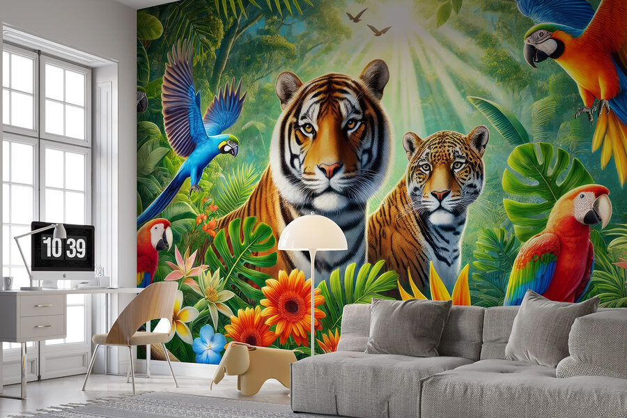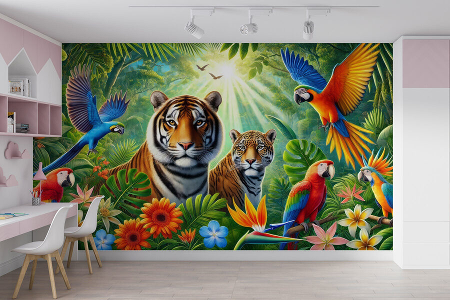 Βυθιστείτε σε μια χώρα θαυμάτων της ζούγκλας με αυτή την εκπληκτική τοιχογραφία τοίχου! Φανταστείτε να επιστρέφετε σπίτι σε μια ζωντανή σκηνή γεμάτη ζωή – οι τίγρεις χαλαρώνουν και οι πολύχρωμοι παπαγάλοι δίνουν παράσταση. Είναι σαν να έχετε μια περιπέτεια ακριβώς στο σαλόνι σας. Μπορείτε σχεδόν να ακούσετε τους ήχους των φύλλων που θροΐζουν και τα παιχνιδιάρικα κράξαλα. Τοποθετήστε αυτή την τοιχογραφία στον τοίχο σας και ξαφνικά ο χώρος σας μοιάζει με ένα καταπράσινο καταφύγιο, έτοιμο για τροπικές διακοπές ανά πάσα στιγμή. Ιδανικό για όσους αγαπούν τη φύση ή απλά χρειάζονται μια φωτεινή σπίθα στο σπίτι τους. Σοβαρά, ποιος δεν θα χαμογελούσε κάθε φορά που θα περνούσε από εκεί; Είναι μια πανδαισία για τα μάτια!