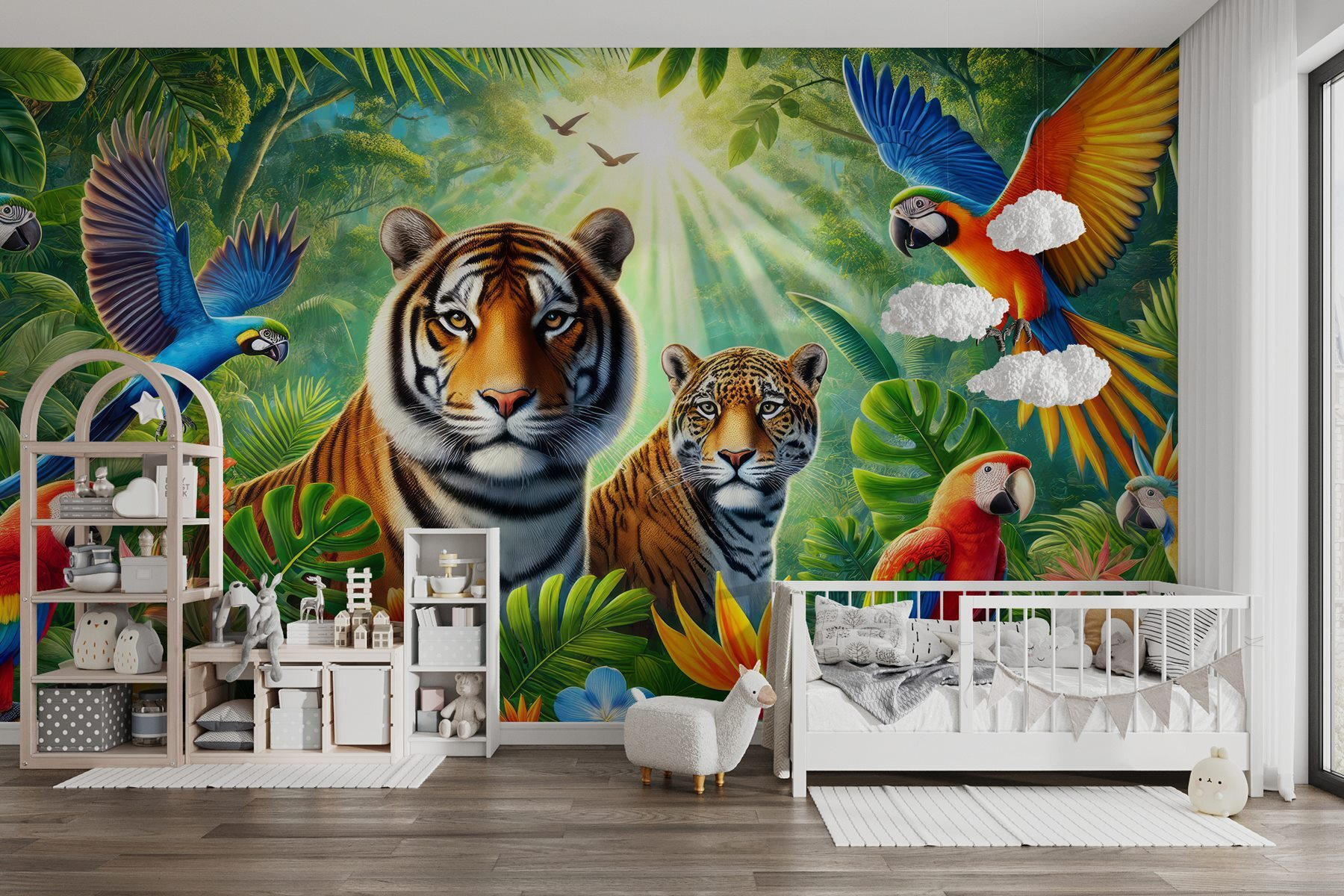 Βυθιστείτε σε μια χώρα θαυμάτων της ζούγκλας με αυτή την εκπληκτική τοιχογραφία τοίχου! Φανταστείτε να επιστρέφετε σπίτι σε μια ζωντανή σκηνή γεμάτη ζωή – οι τίγρεις χαλαρώνουν και οι πολύχρωμοι παπαγάλοι δίνουν παράσταση. Είναι σαν να έχετε μια περιπέτεια ακριβώς στο σαλόνι σας. Μπορείτε σχεδόν να ακούσετε τους ήχους των φύλλων που θροΐζουν και τα παιχνιδιάρικα κράξαλα. Τοποθετήστε αυτή την τοιχογραφία στον τοίχο σας και ξαφνικά ο χώρος σας μοιάζει με ένα καταπράσινο καταφύγιο, έτοιμο για τροπικές διακοπές ανά πάσα στιγμή. Ιδανικό για όσους αγαπούν τη φύση ή απλά χρειάζονται μια φωτεινή σπίθα στο σπίτι τους. Σοβαρά, ποιος δεν θα χαμογελούσε κάθε φορά που θα περνούσε από εκεί; Είναι μια πανδαισία για τα μάτια!