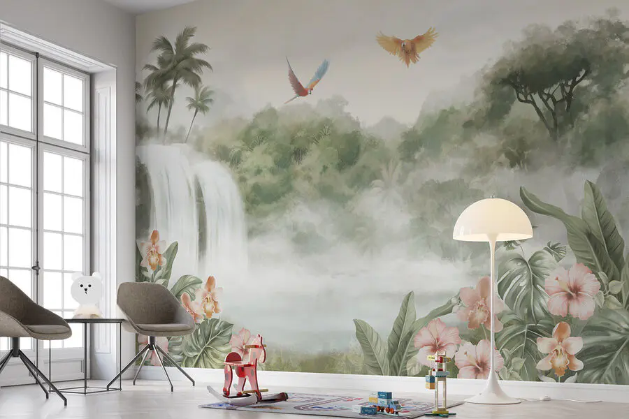 Μεταμορφώστε οποιονδήποτε χώρο σε έναν γαλήνιο τροπικό παράδεισο με αυτή την εκπληκτική τοιχογραφία καταρράκτη με ζωντανά πουλιά που υψώνονται πάνω από πλούσια βλάστηση. Φανταστείτε να μπαίνετε σε μια γαλήνια όαση κάθε μέρα, καθώς ο απαλός ήχος του καταρράκτη νερού γεμίζει το μυαλό σας. Τα ντελικάτα ροζ λουλούδια ξεπροβάλλουν μέσα από το φύλλωμα, προσθέτοντας μια πινελιά χρώματος που είναι ιδανική για να φωτίσει μια ζεστή γωνιά ή να κάνει μια τολμηρή δήλωση σε έναν χαρακτηριστικό τοίχο. Είναι σαν να φέρνετε ένα κομμάτι της φύσης σε εσωτερικό χώρο – δεν απαιτούνται μπότες πεζοπορίας! Ιδανική για τους λάτρεις της φύσης, αυτή η τοιχογραφία σας προσκαλεί να σταματήσετε, να αναπνεύσετε και να απολαύσετε ένα μικρό κομμάτι ηρεμίας στο σπίτι σας. Επιπλέον, μπορεί να σας εμπνεύσει ονειροπολήσεις για τροπικές διακοπές, ακόμη και αν έξω είναι ένα ψυχρό απόγευμα. Αγκαλιάστε την ομορφιά και αφήστε τους τοίχους σας να διηγηθούν μια ιστορία!