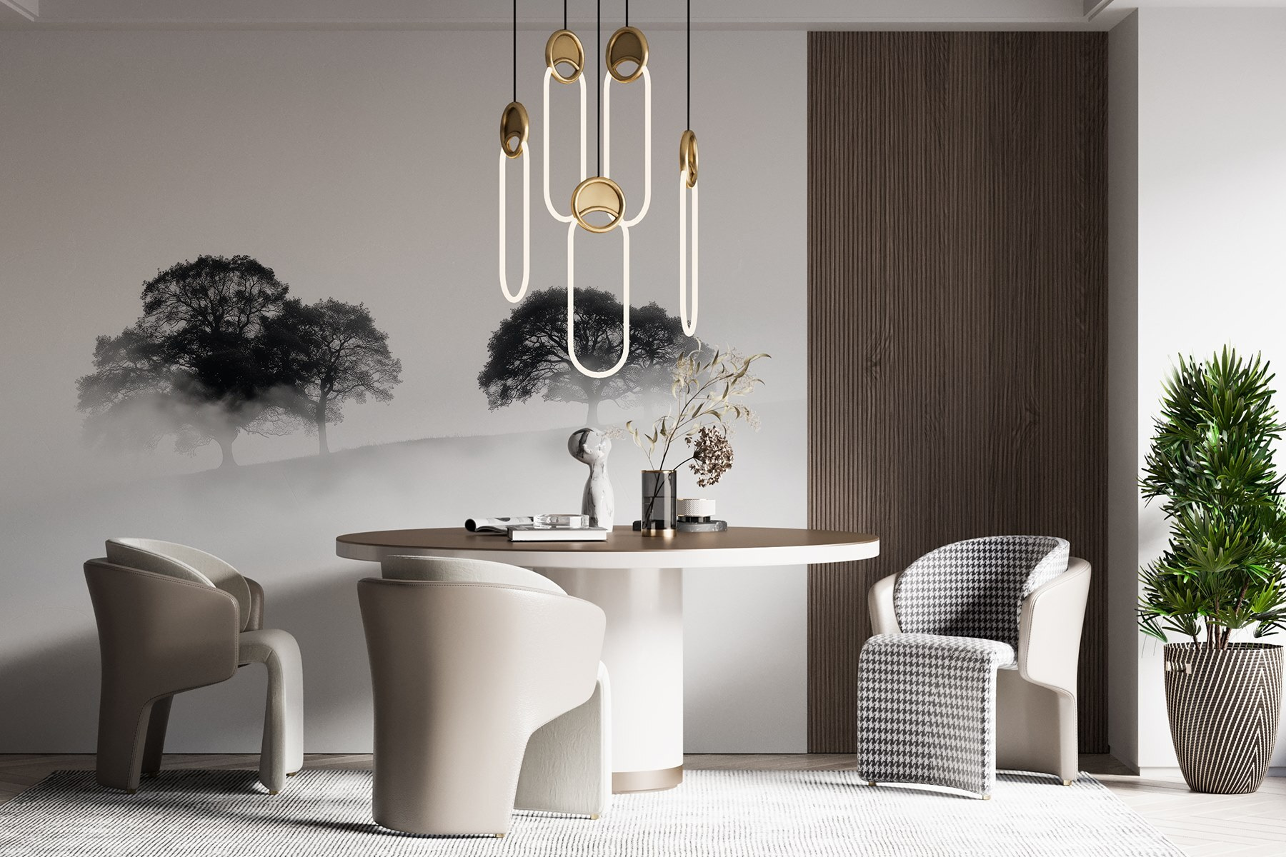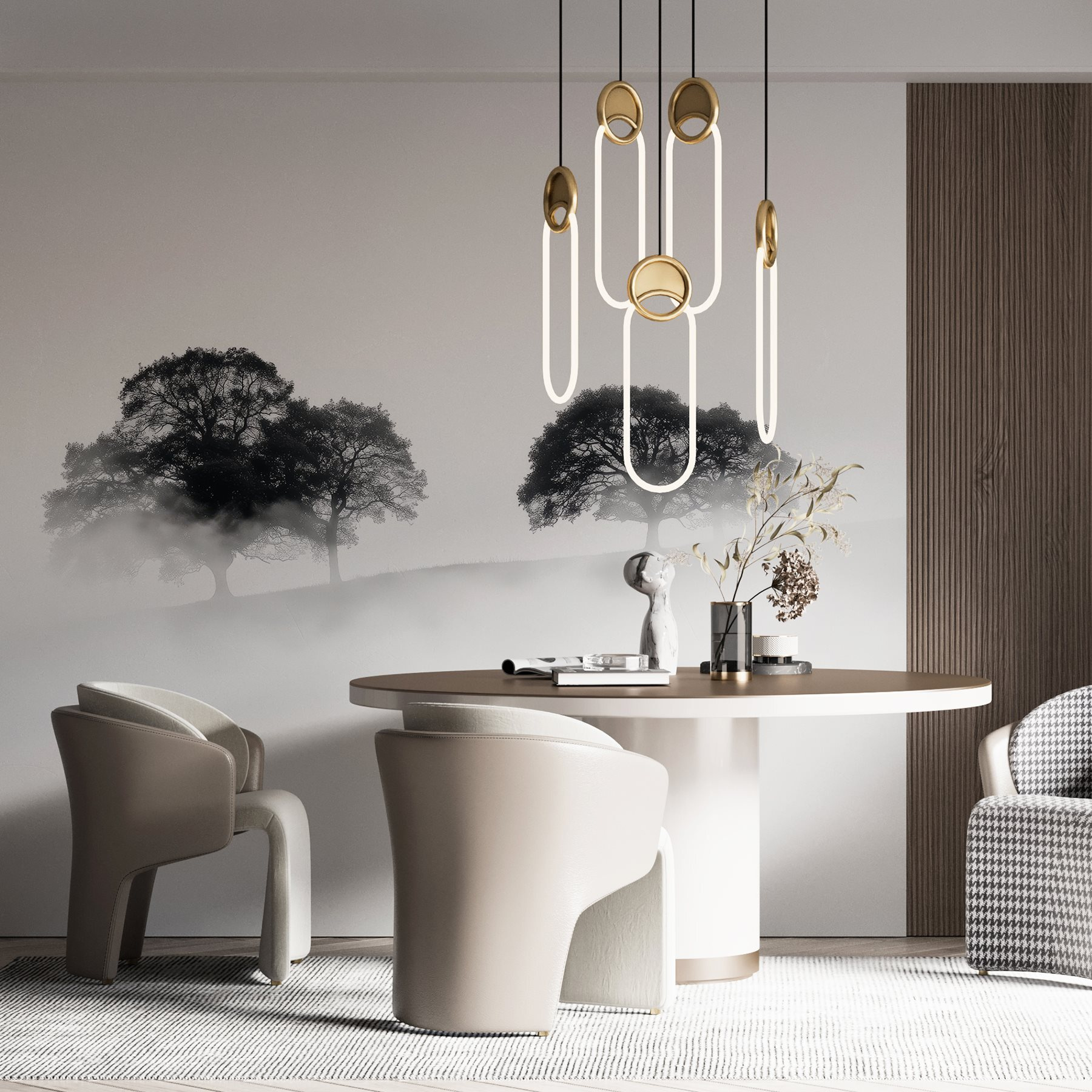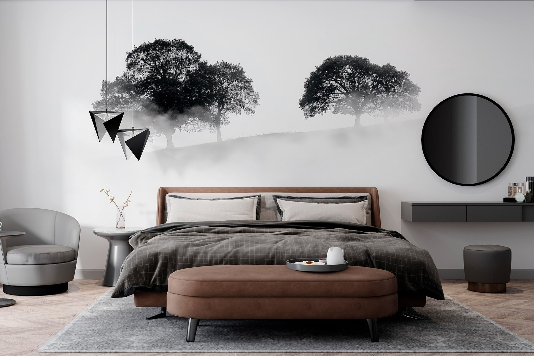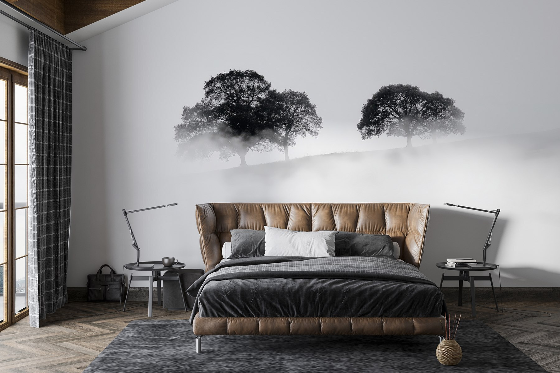 Μεταμορφώστε οποιοδήποτε δωμάτιο σε μια γαλήνια απόδραση με αυτή τη μαγευτική τοιχογραφία με δέντρα τυλιγμένα στην ομίχλη. Φανταστείτε να μπαίνετε στο χώρο σας και να αισθάνεστε αμέσως την ηρεμία να σας κατακλύζει, όπως μια απαλή ομίχλη που τυλίγεται γύρω από τους ώμους σας ένα ήσυχο πρωινό. Η διακριτική κομψότητα των σιλουετών προσθέτει ένα άγγιγμα μυστηρίου, ιδανικό για να προκαλέσει συζήτηση ή περισυλλογή.