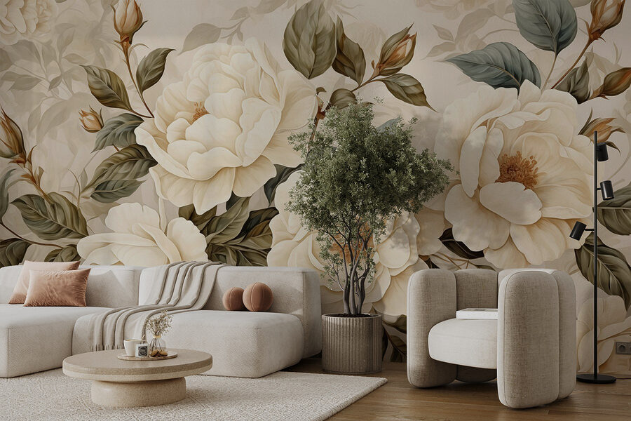 Η μετατροπή ενός δωματίου σε μια ζεστή όαση είναι πανεύκολη με το “Delicate Blooms in Soft Tones”. Φανταστείτε να μπαίνετε σε έναν χώρο όπου κρεμώδεις παιώνιες ανθίζουν αβίαστα στους τοίχους, τυλίγοντάς σας σε απαλές αποχρώσεις που σας κάνουν να αισθάνεστε σχεδόν ονειρεμένοι. Είναι σαν να έχετε τον δικό σας κήπο, χωρίς τις ενοχλητικές μέλισσες. Ιδανικό για εκείνες τις μέρες που θέλετε απλώς να πιείτε τσάι, να κουλουριαστείτε με ένα καλό βιβλίο ή να αφεθείτε σε ονειροπολήσεις για ανοιξιάτικα πικνίκ.