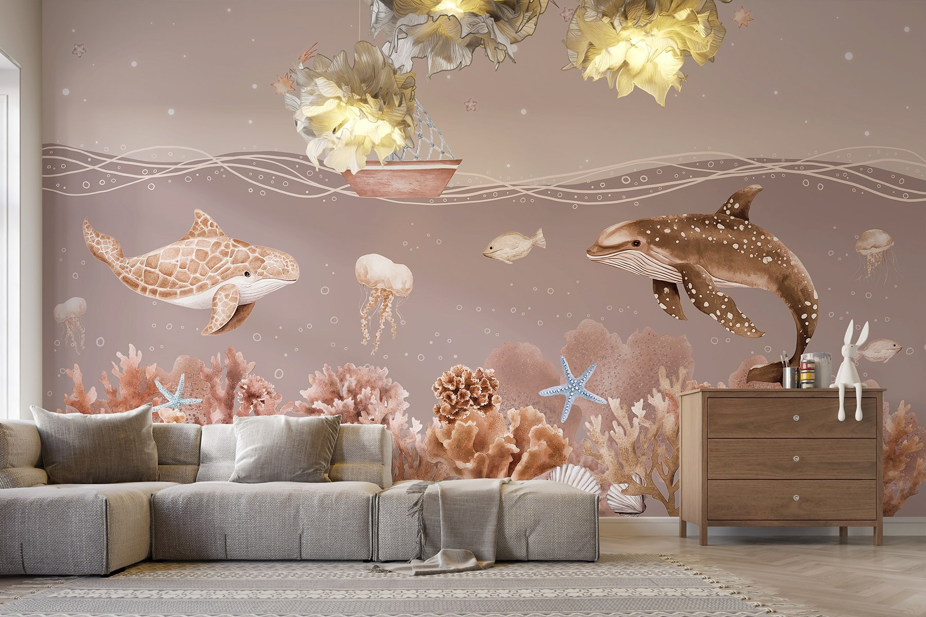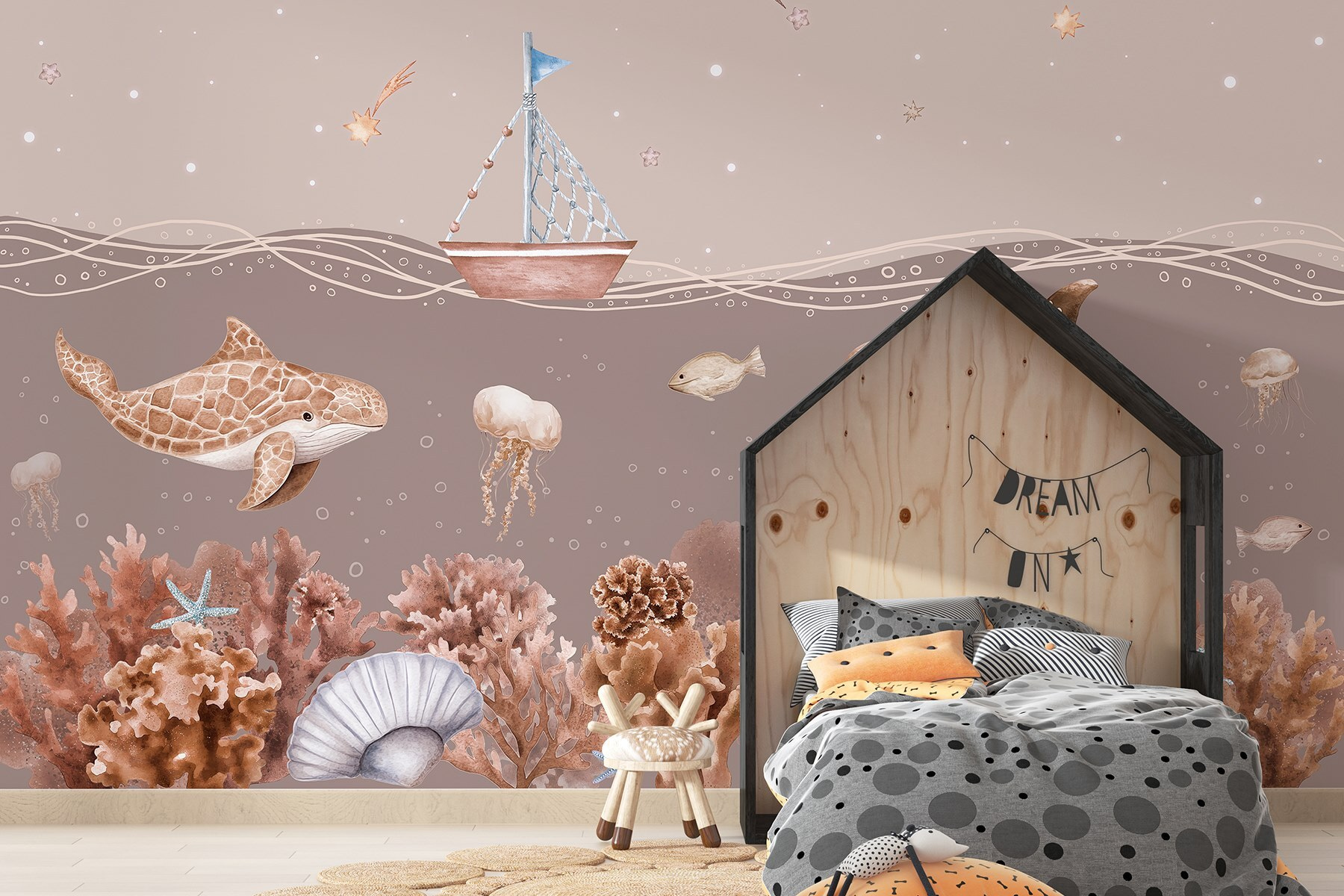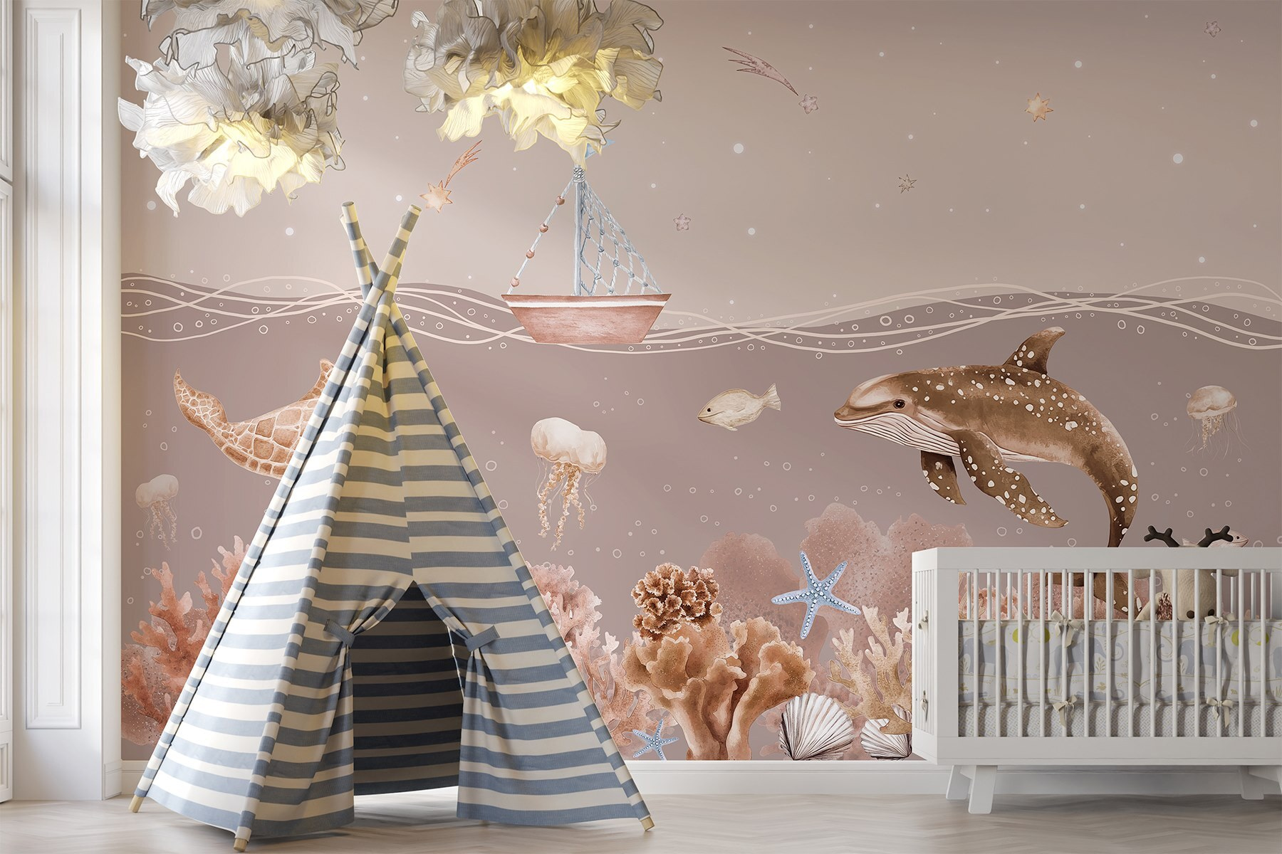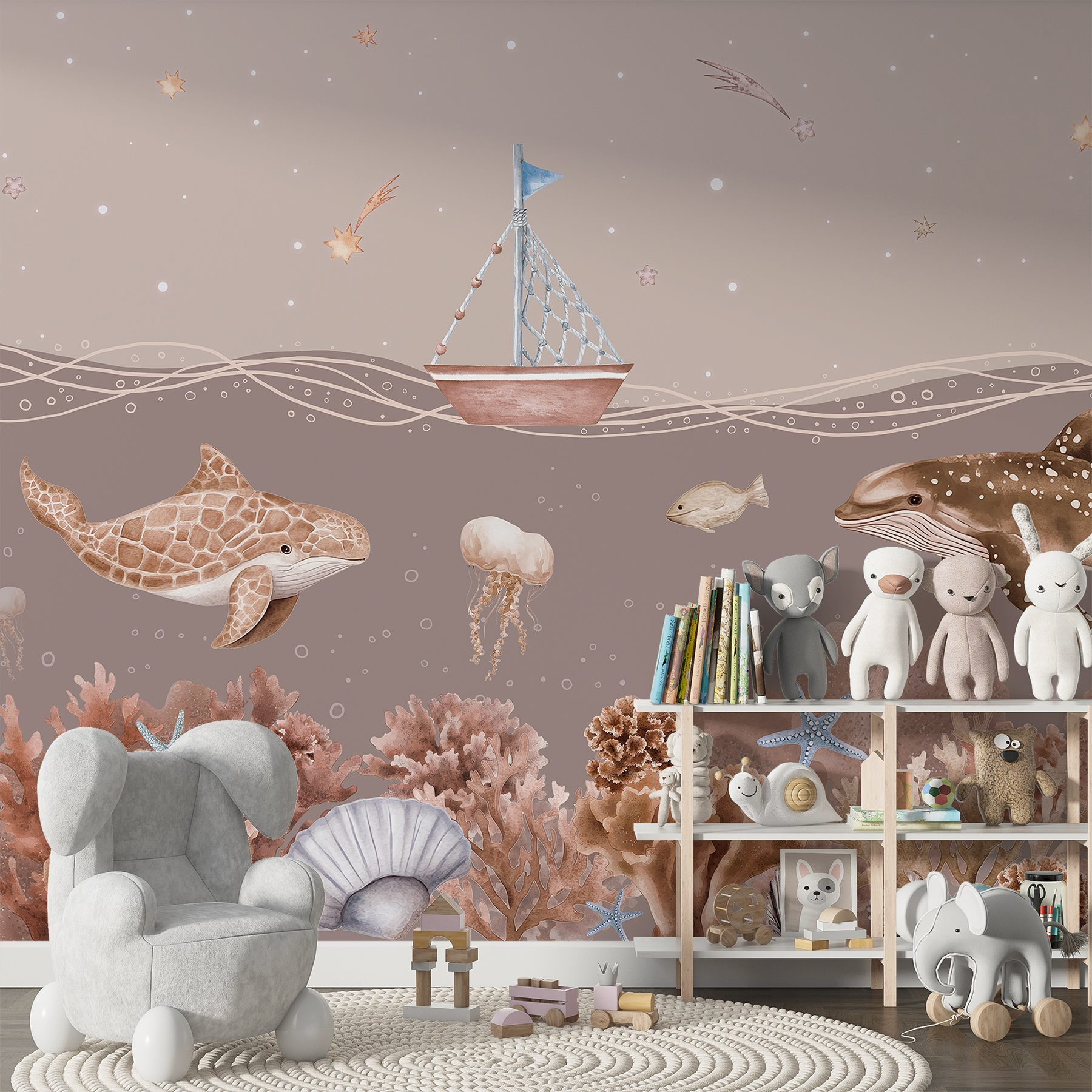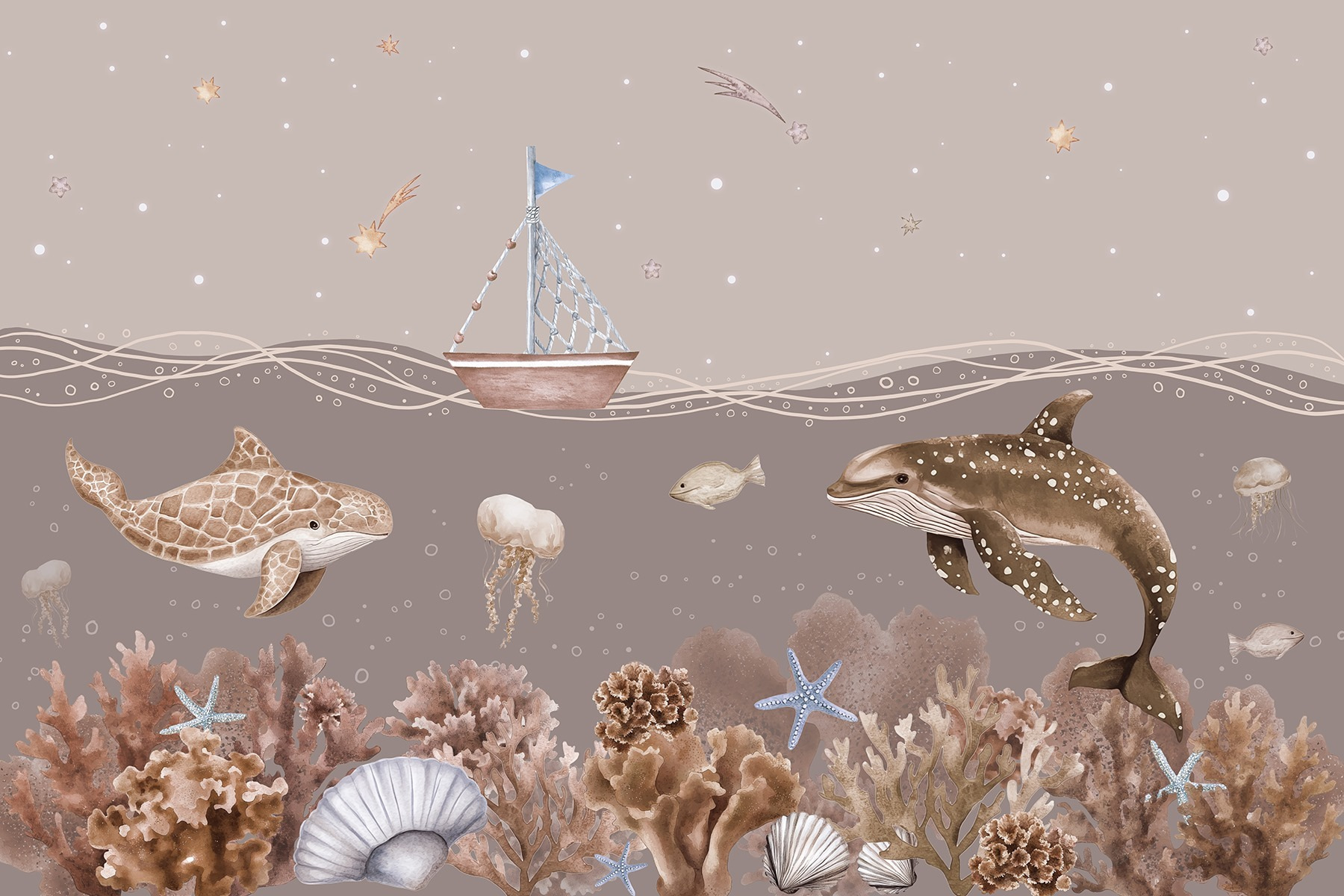 Βυθιστείτε σε έναν κόσμο γεμάτο ιδιοτροπίες με αυτή την εκπληκτική τοιχογραφία τοίχου, “Sea Life with a Boat and Fish” (Θαλάσσια ζωή με βάρκα και ψάρια). Φανταστείτε το: ένα ευγενικό ιστιοφόρο που λικνίζεται πάνω από την παιχνιδιάρικη θαλάσσια ζωή που μοιάζει σχεδόν ζωντανή. Είναι σαν μια μυστική υποβρύχια περιπέτεια ακριβώς στο σαλόνι σας! Φανταστείτε τα παιδιά (ή τους ενήλικες!) να ονειρεύονται υποβρύχιες ιστορίες καθώς κοιτάζουν τη χελώνα, τις μέδουσες και τα ζωντανά κοράλλια. Αυτή η τοιχογραφία φέρνει μια ήρεμη, παραθαλάσσια ατμόσφαιρα σε κάθε χώρο και προσθέτει μια βουτιά χαράς. Ιδανική για σπίτια, παιδικά δωμάτια ή όπου χρειάζεται μια πινελιά ωκεάνιας μαγείας. Ποιος δεν θα χαμογελούσε με αυτή τη χαρούμενη σκηνή;