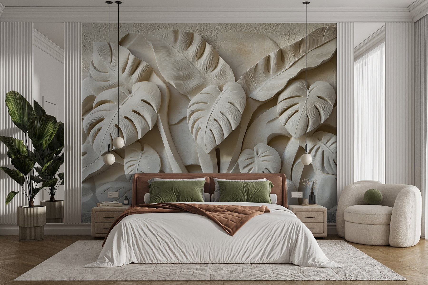 Μπείτε σε μια γαλήνια ζούγκλα με τις “Τοιχογραφίες πέτρας με σκαλίσματα φύλλων”. Αυτό το εκπληκτικό κομμάτι φέρνει ένα άγγιγμα της φύσης απευθείας στους τοίχους σας, προσφέροντας μια ήρεμη όαση που μοιάζει τόσο μοντέρνα όσο και διαχρονική. Φανταστείτε να πίνετε τον πρωινό σας καφέ ενώ περιβάλλεστε από πλούσια, φυλλώδη vibes – μιλάμε για μια άμεση τόνωση της διάθεσης!