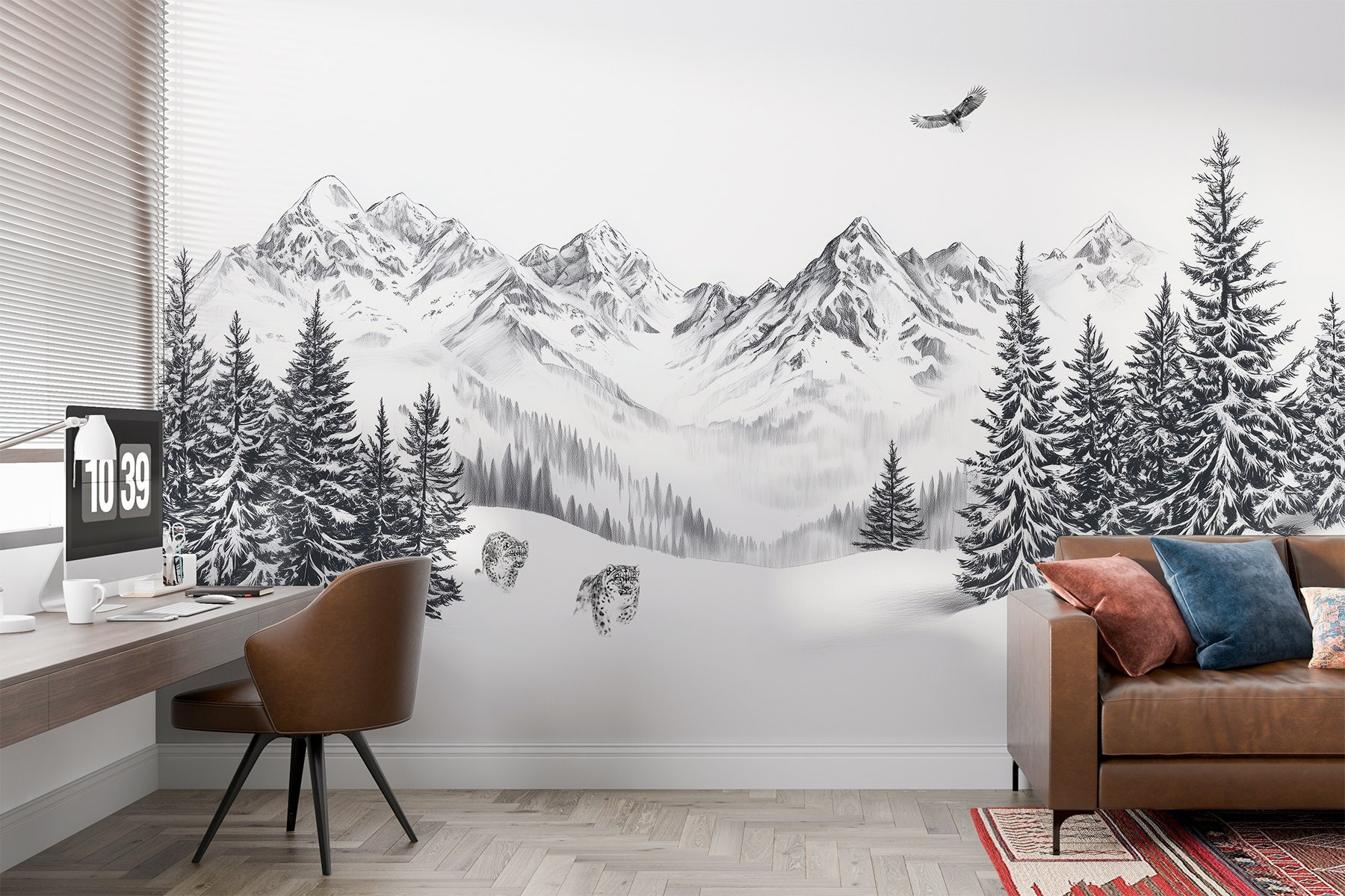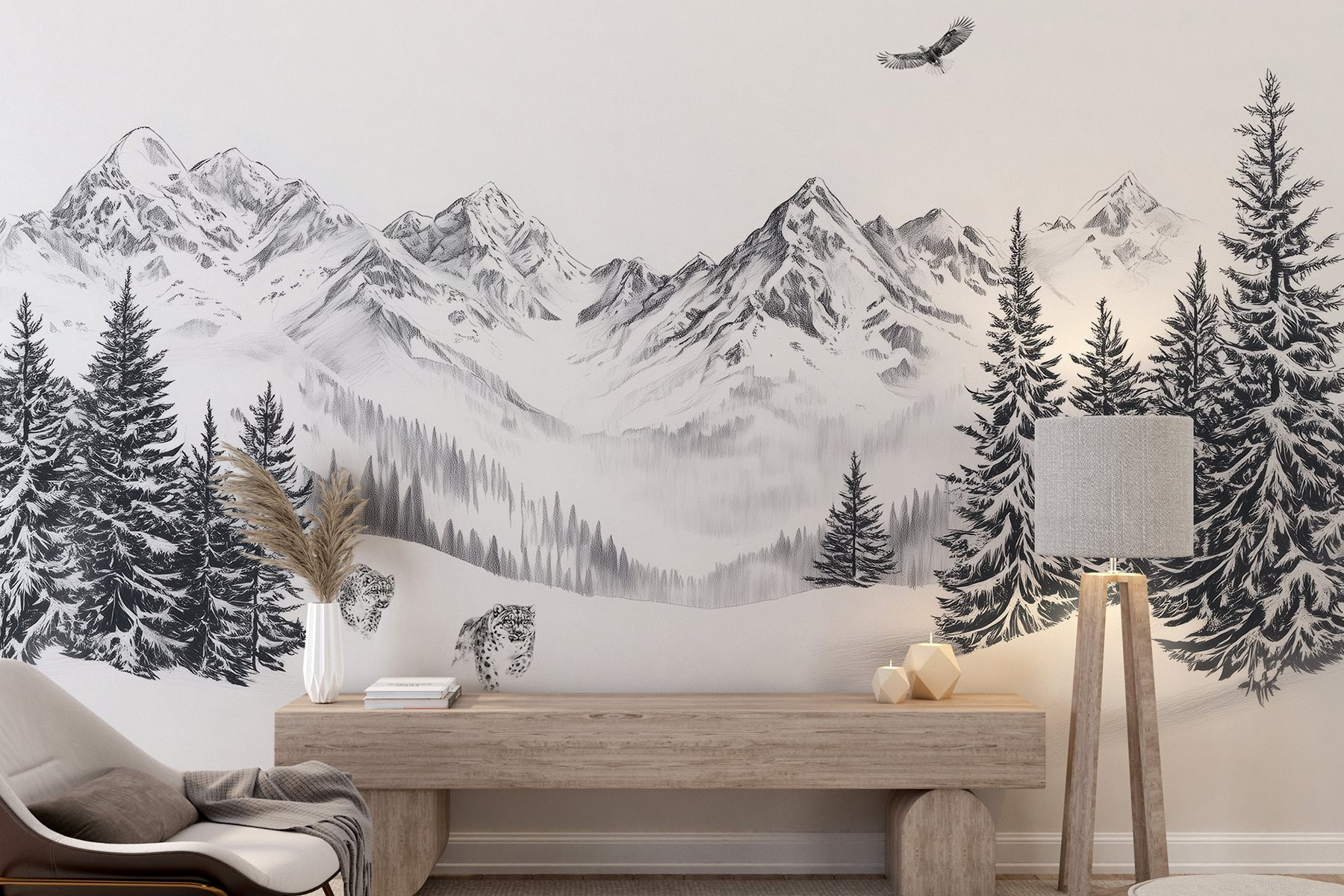 Μεταμορφώστε οποιονδήποτε τοίχο σε μια γαλήνια απόδραση με αυτή την εκπληκτική τοιχογραφία χιονισμένου ορεινού τοπίου. Φανταστείτε την απαλή ησυχία του χιονιού που πέφτει, καθώς τα μεγαλοπρεπή βουνά υψώνονται στα σύννεφα, ενώ ένα μοναχικό πουλί γλιστράει πάνω από το κεφάλι σας. Είναι σαν να φέρνετε ένα ειρηνικό κομμάτι της φύσης στους εσωτερικούς χώρους. Φανταστείτε να πίνετε τον πρωινό σας καφέ, να ατενίζετε αυτή την ομορφιά και να αισθάνεστε μια βιασύνη ηρεμίας να σας κατακλύζει. Ιδανική για φιλόξενες γωνιές ή τολμηρούς τοίχους, αυτή η τοιχογραφία όχι μόνο προσθέτει χαρακτήρα αλλά και προσκαλεί σε ονειροπολήσεις για χιονισμένες πεζοπορίες και καθαρό αέρα του βουνού. Επιπλέον, ποιος δεν θα ήθελε δύο θρασύδειλες λεοπαρδάλεις κοντά του; Είναι έναυσμα για συζήτηση και απόδραση, όλα μαζί!