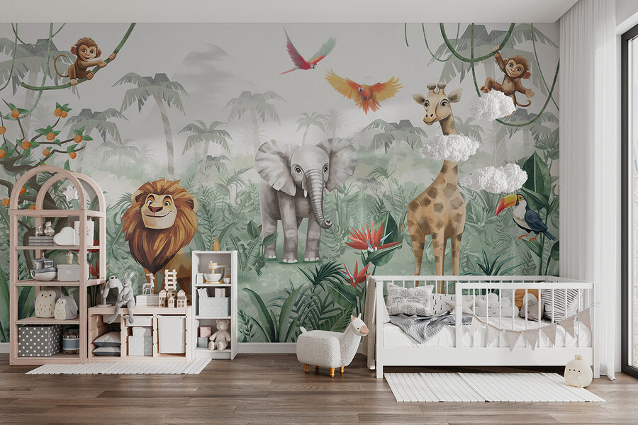 Μεταμορφώστε κάθε χώρο σε μια ζωντανή περιπέτεια ζούγκλας με αυτή τη γοητευτική τοιχογραφία! Φανταστείτε έναν ελέφαντα και ένα χαρούμενο λιοντάρι να ξεφαντώνουν ανάμεσα σε φίλους όπως μαϊμούδες και πολύχρωμα πουλιά – είναι σαν ένα πάρτι στον τοίχο σας! Αυτή η τοιχογραφία φέρνει μια αίσθηση χαράς και θαυμασμού, ιδανική για να εξάψει τη φαντασία των παιδιών ή να προσθέσει μια παιχνιδιάρικη πινελιά σε οποιοδήποτε δωμάτιο. Φανταστείτε άνετες γωνιές ανάγνωσης όπου τα μικρά παιδιά εξερευνούν νέους κόσμους ή χαρούμενα παιδικά δωμάτια που μοιάζουν με σαφάρι. Είναι σαν να προσκαλείτε τη φύση στο σπίτι σας – χωρίς να χρειάζεται να καθαρίζετε!