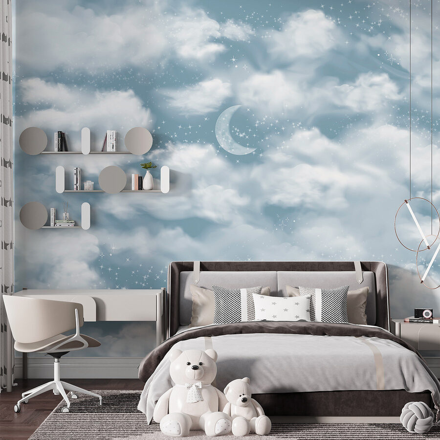 Μεταμορφώστε έναν απλό τοίχο σε μια ονειρική απόδραση με την τοιχογραφία “Moon in the Sky”. Φανταστείτε να μπαίνετε σε ένα δωμάτιο και να σας υποδέχονται απαλά, νερά νεφελώματα ακουαρέλας, ένα απαλό φεγγάρι που ξεπροβάλλει και μια πινελιά αστέρια που λαμπυρίζουν. Είναι σαν ένα μικρό κομμάτι του νυχτερινού ουρανού, άνετο αλλά και μαγευτικό. Ιδανική για ένα ηρεμιστικό υπνοδωμάτιο ή ένα ιδιόρρυθμο σαλόνι, αυτή η τοιχογραφία προσκαλεί σε ονειροπόληση και παρατήρηση των αστεριών. Ποιος δεν θα ήθελε να κουλουριαστεί με ένα βιβλίο κάτω από αυτά τα σύννεφα; Απλά φανταστείτε το – αγκαλιασμένοι με την αγαπημένη σας κουβέρτα, πίνοντας τσάι ενώ το φεγγάρι σας κλείνει το μάτι. Λίγη μαγεία για κάθε γωνιά!