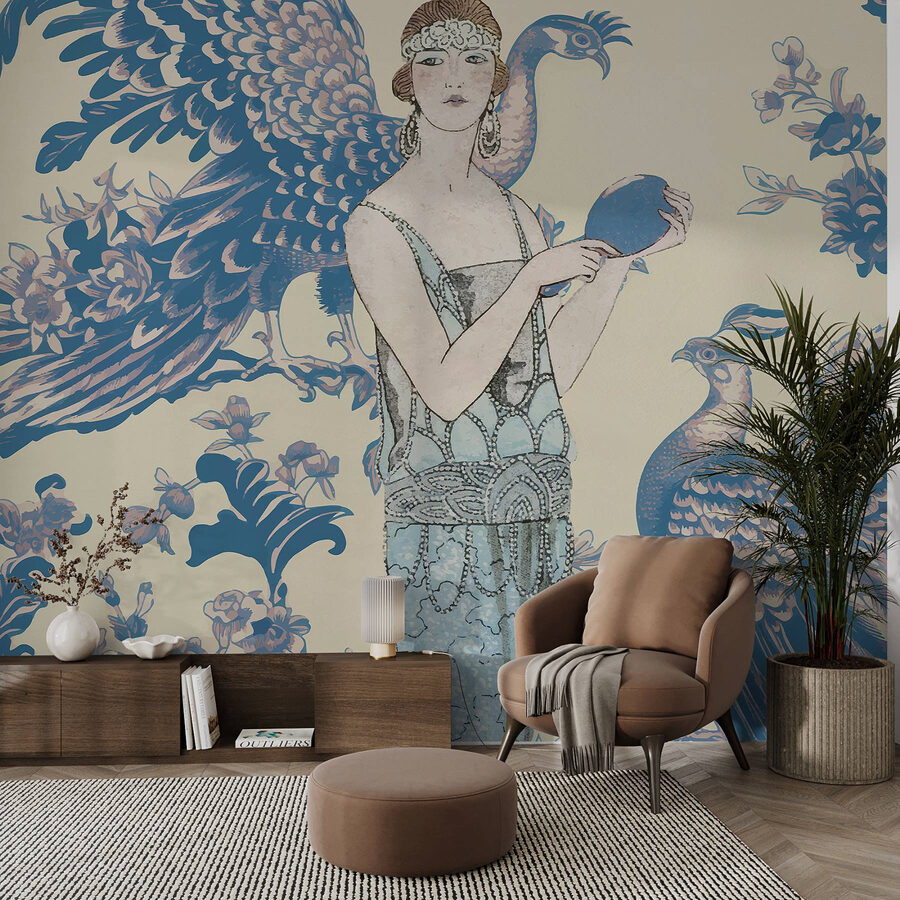 Αναβαθμίστε το χώρο σας με αυτή την εκπληκτική τοιχογραφία με μια χαριτωμένη γυναίκα που κρατά ένα στρογγυλό μπλε αντικείμενο, περιτριγυρισμένη από ιδιόρρυθμα παγώνια και ντελικάτα λουλούδια. Είναι σαν να έχετε ένα ονειρικό έργο τέχνης ακριβώς στον τοίχο σας! Φανταστείτε να ξυπνάτε κάθε μέρα με αυτή τη βουτιά χρώματος και κομψότητας – τέλεια για να δημιουργήσετε μια γαλήνια ατμόσφαιρα. Είτε πρόκειται για μια ζεστή γωνιά είτε για ένα κομψό σαλόνι, αυτή η τοιχογραφία σας προσκαλεί σε έναν κόσμο ομορφιάς. Οι καλεσμένοι δεν θα μπορέσουν να αντισταθούν στο θαυμασμό της και ίσως εμπνεύσει μια αυθόρμητη συζήτηση για την τέχνη, τα ταξίδια ή αυτά τα άπιαστα παγώνια – γιατί ποιος δεν αγαπάει λίγη λάμψη;