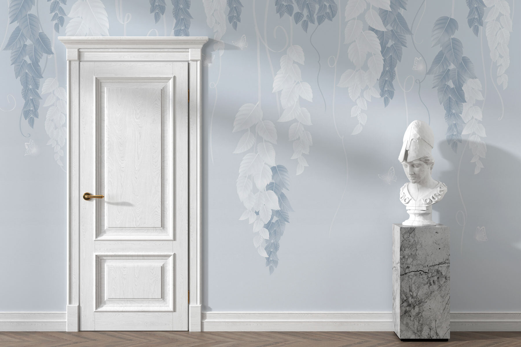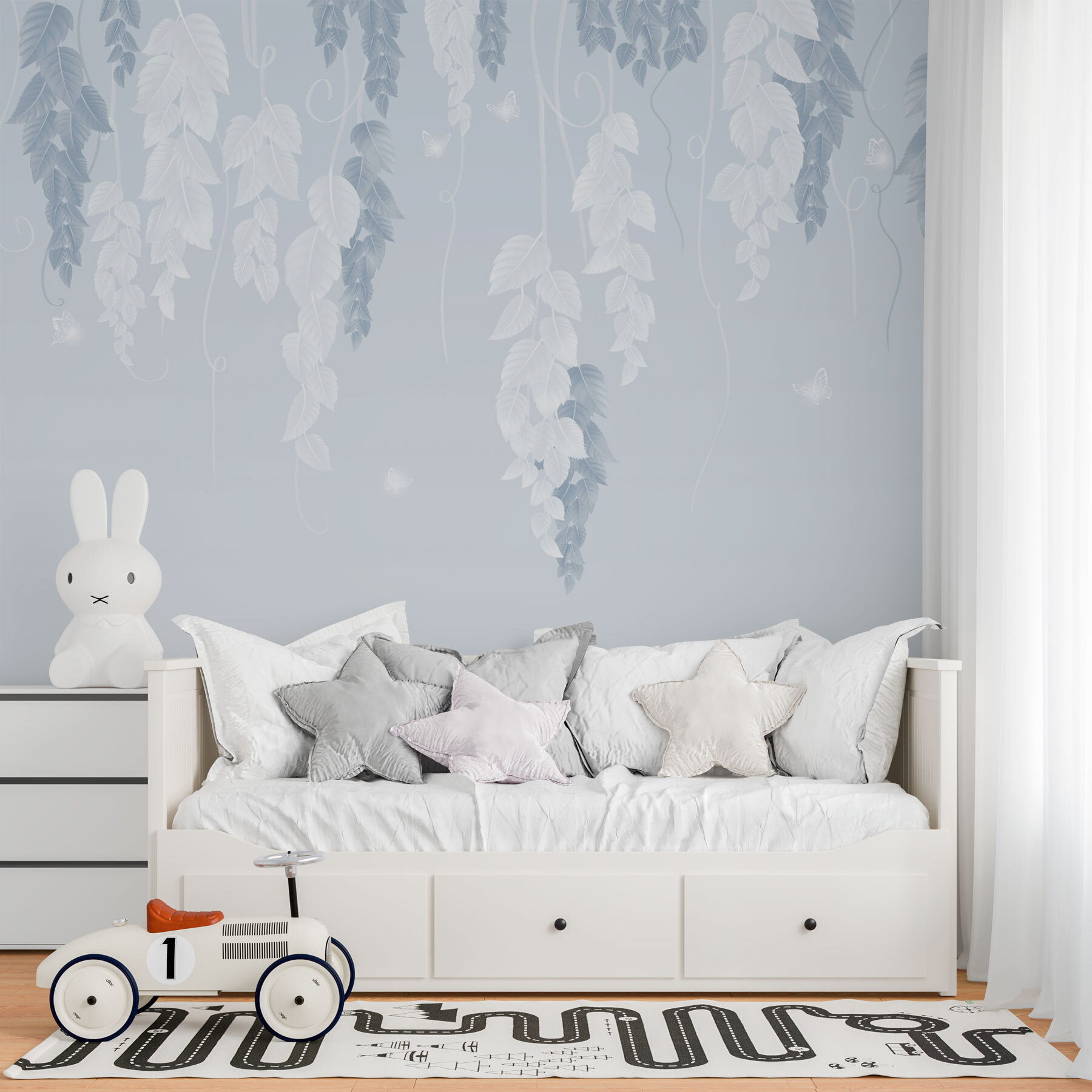 Μεταμορφώστε οποιονδήποτε χώρο σε μια γαλήνια απόδραση με αυτή την εκπληκτική τοιχογραφία τοίχου, “Λευκά και μπλε φύλλα και πεταλούδες”. Φανταστείτε να μπαίνετε σε έναν ονειρεμένο κήπο, όπου λεπτεπίλεπτα φύλλα πέφτουν απαλά καταρράκτες και πεταλούδες πετούν σε απαλό μπλε και λευκό χρώμα. Είναι σαν να φέρνετε την ηρεμία της φύσης στους εσωτερικούς χώρους – τέλεια για αυτή τη ζεστή γωνιά ανάγνωσης ή ένα ήσυχο υπνοδωμάτιο. Επιπλέον, τα δροσερά χρώματα δημιουργούν μια αναζωογονητική ατμόσφαιρα, καθιστώντας το παιχνιδάκι που ταιριάζει με όλα τα είδη διακόσμησης. Δεν είναι απλώς ένας τοίχος- είναι ένα μικρό κομμάτι ηρεμίας που ψιθυρίζει: “Χαλαρώστε, το αξίζετε”. Προχωρήστε λοιπόν, αγκαλιάστε τον εσωτερικό σας γκουρού του σχεδιασμού – αυτή η τοιχογραφία μπορεί να εμπνεύσει ένα πάρτι τσαγιού με καλούς φίλους ή μια στιγμή ήσυχης περισυλλογής. Ποιος δεν θα ήθελε αυτό το μικρό άγγιγμα της φύσης;