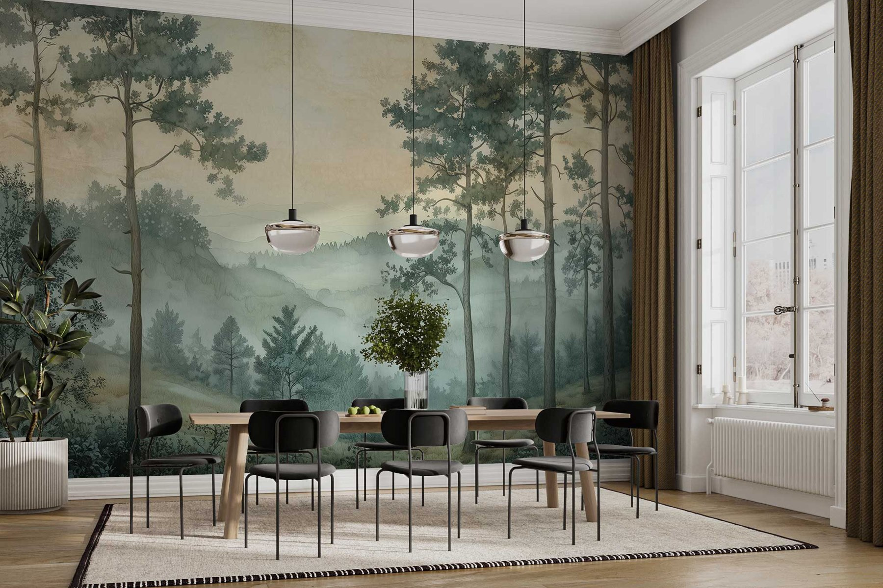 Φανταστείτε να μπαίνετε σε ένα γαλήνιο δάσος, τυλιγμένο σε απαλή ομίχλη – αυτή η τοιχογραφία κάνει ακριβώς αυτό! Με τα καταπράσινα δέντρα και το ονειρικό τοπίο, φέρνει ένα κομμάτι της φύσης στο σπίτι σας. Ιδανική για αυτές τις φιλόξενες γωνιές ή για έναν πιο ανοιχτό χώρο που αποζητά λίγη ψυχρή ατμόσφαιρα. Ποιος χρειάζεται διακοπές όταν ο τοίχος σας μπορεί να ψιθυρίζει τα μυστικά των δασικών μονοπατιών; Κάθε ματιά θα μπορούσε να θυμίσει αυτή την ειρηνική πεζοπορία, μαζί με το απαλό θρόισμα των φύλλων. Μεταμορφώστε το δωμάτιό σας σε ένα γαλήνιο καταφύγιο και νιώστε σαν να έχετε τη φύση στα χέρια σας – χωρίς το σπρέι για τα έντομα!
