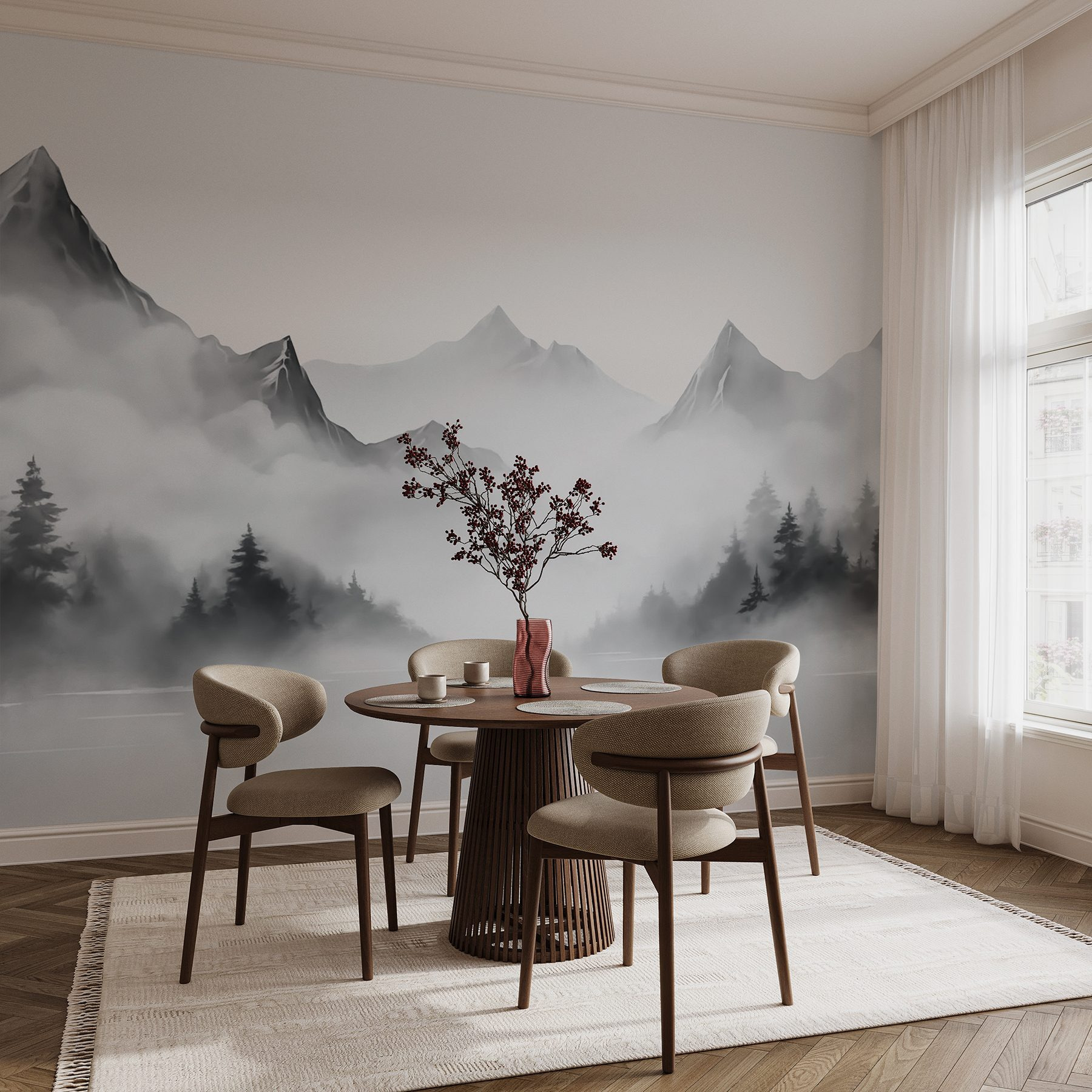 Φανταστείτε να μπαίνετε σε μια ζεστή καμπίνα όπου η απαλή ομίχλη κυλάει πάνω από μαγευτικά βουνά. Αυτή η τοιχογραφία, “Τοπίο με ομίχλη στο βουνό”, φέρνει αυτή την ατμόσφαιρα στο χώρο σας, μετατρέποντας το συνηθισμένο σε κάτι μαγικό. Το ήπιο μείγμα από απαλούς τόνους τυλίγει το δωμάτιό σας με ζεστασιά, σαν μια αγκαλιά από τη φύση, αλλά χωρίς τις λασπωμένες μπότες. Είναι ιδανικό για ένα σαλόνι, ένα υπνοδωμάτιο ή ακόμα και για μια ήσυχη γωνιά ανάγνωσης. Απλά φανταστείτε να πίνετε τσάι, χαμένοι σε ένα καλό βιβλίο, ενώ η γαλήνια θέα ψιθυρίζει χαλάρωση. Είναι σαν να έχετε το δικό σας κομμάτι από τη φύση, χωρίς τα ενοχλητικά ζωύφια. Η φιλόξενη γοητεία αυτής της τοιχογραφίας κάνει κάθε μέρα να μοιάζει με μια μίνι απόδραση.