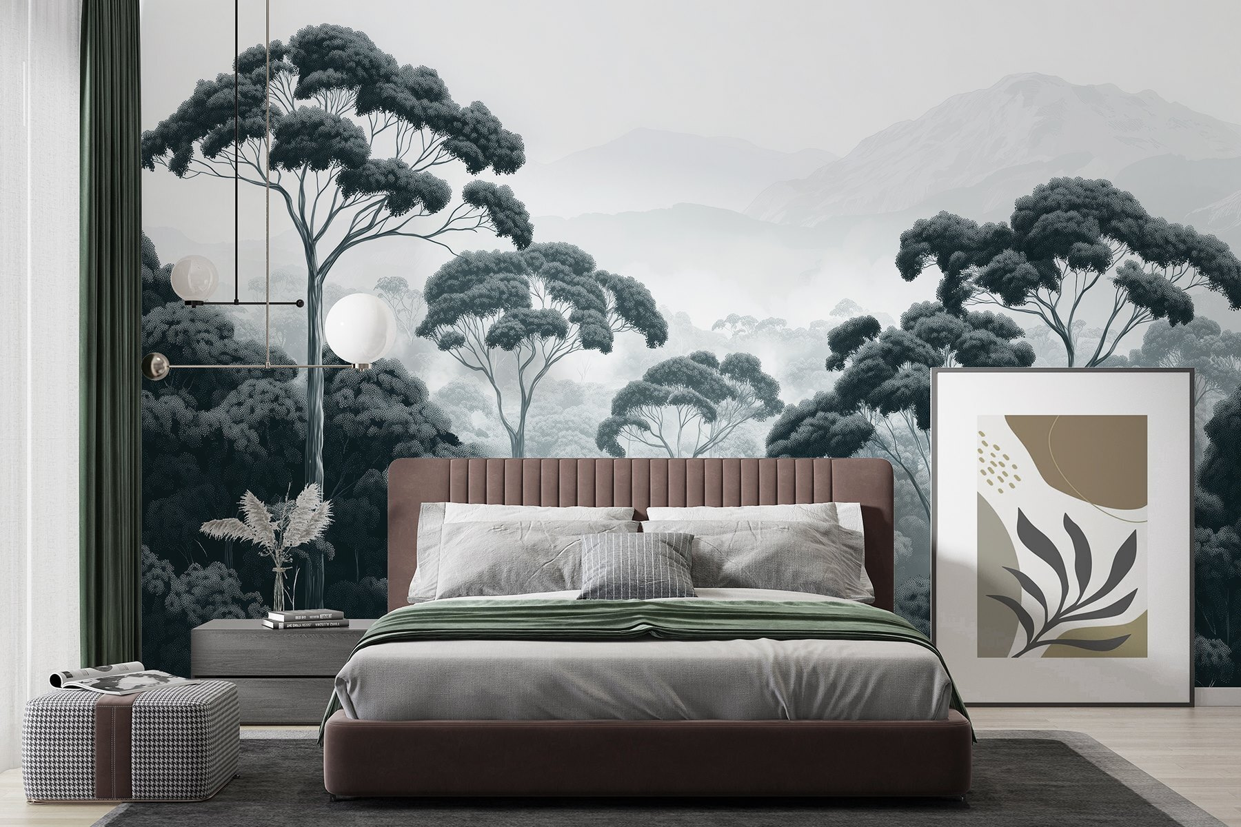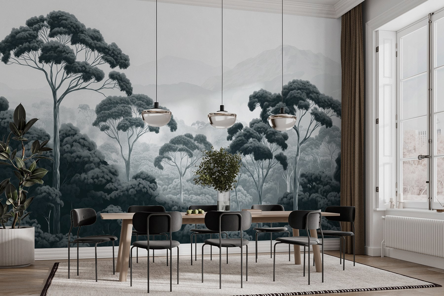 Μεταμορφώστε οποιοδήποτε δωμάτιο σε μια γαλήνια απόδραση με αυτή την εκπληκτική τοιχογραφία τοίχου με ένα δάσος με πανύψηλα δέντρα και ομιχλώδη βουνά. Φανταστείτε να πίνετε τον πρωινό σας καφέ ενώ περιβάλλεστε από τη φύση – χωρίς ενοχλητικά κουνούπια, μόνο αγνή ατμόσφαιρα! Το έργο τέχνης έχει μια ηρεμιστική ασπρόμαυρη παλέτα, ιδανική για τη δημιουργία ενός άνετου, στοχαστικού χώρου. Είτε πρόκειται για ένα σαλόνι είτε για ένα γραφείο στο σπίτι, αυτή η τοιχογραφία μπορεί να εμπνεύσει αυτές τις ονειροπολήσεις για πεζοπορία στο δάσος ή για να χαλαρώσετε με ένα καλό βιβλίο. Είναι σαν να έχετε ένα κομμάτι από τη μεγάλη ύπαιθρο ακριβώς στον τοίχο σας. Ποιος ήξερε ότι η φύση θα μπορούσε να είναι τόσο κομψή;