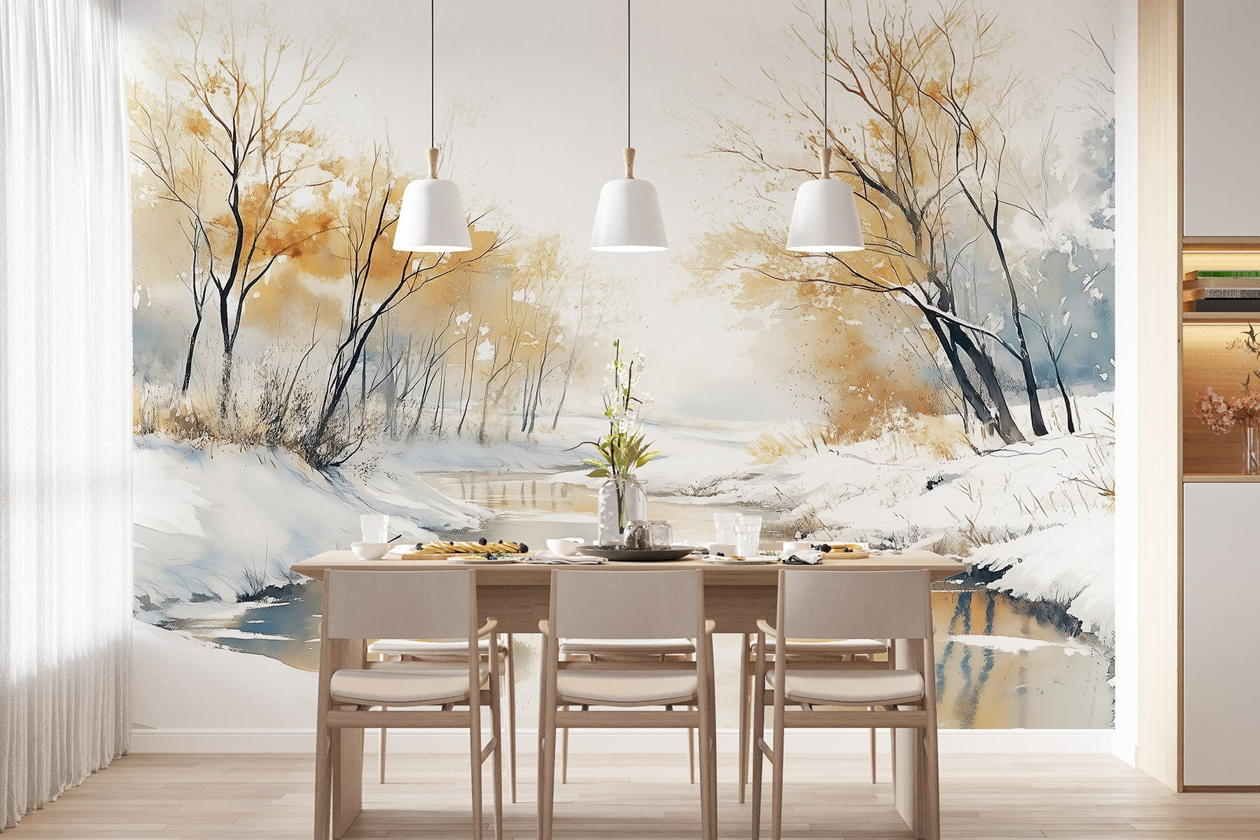 Φανταστείτε να μπαίνετε σε μια χιονισμένη χώρα των θαυμάτων κάθε φορά που μπαίνετε στο δωμάτιό σας. Αυτή η τοιχογραφία “Ταπετσαρίες River with Snow and Trees” αποτυπώνει αυτή τη γαλήνια ατμόσφαιρα σαν μια ζεστή κουβέρτα σε μια ψυχρή μέρα. Οι απαλές αποχρώσεις ακουαρέλας αναμειγνύονται απαλά, δημιουργώντας μια ειρηνική σκηνή ποταμού που πλαισιώνεται από λεπτά δέντρα, όλα πασπαλισμένα με ένα στρώμα χιονιού.