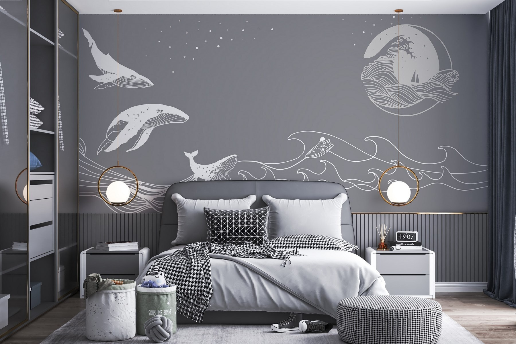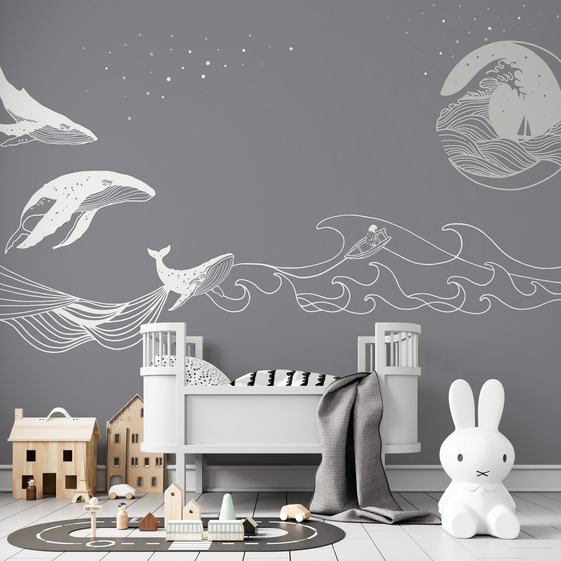 Βυθιστείτε σε έναν κόσμο γεμάτο ιδιοτροπίες με αυτή την τοιχογραφία που απεικονίζει μια μεγαλοπρεπή φάλαινα και έναν μοναχικό άνθρωπο που πλοηγείται στον ωκεανό. Είναι σαν ένα απαλό κύμα ηρεμίας να κατακλύζει το δωμάτιο, υπενθυμίζοντας σε όλους τις τεράστιες περιπέτειες της ζωής. Φανταστείτε τον εαυτό σας να πίνει τσάι, ενώ ατενίζετε αυτές τις χαριτωμένες φάλαινες – δεν σας προκαλεί απλά χαρά; Οι απαλές αποχρώσεις και οι ρέουσες γραμμές δημιουργούν μια γαλήνια ατμόσφαιρα, ιδανική για να ονειρεύεστε αποδράσεις στην παραλία ή άνετες νύχτες στο σπίτι. Είναι ένας απολαυστικός χορός της φύσης που θα κάνει κάθε καλεσμένο να ρωτάει πού βρήκατε ένα τόσο μαγευτικό κομμάτι!