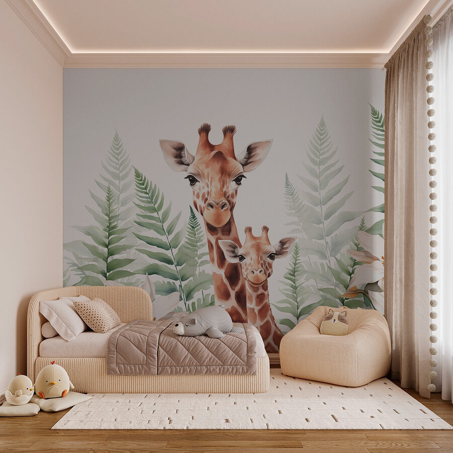 Μεταμορφώστε το χώρο σας σε έναν ιδιόρρυθμο κήπο με αυτή την απολαυστική τοιχογραφία τοίχου με χαριτωμένες καμηλοπαρδάλεις που κρυφοκοιτάζουν μέσα από την πλούσια βλάστηση και τα ντελικάτα λουλούδια. Είναι σαν να φέρνετε ένα άγγιγμα της σαβάνας στο σαλόνι σας! Φανταστείτε να πίνετε τον πρωινό σας καφέ, ενώ αυτοί οι ευγενικοί γίγαντες σας παρακολουθούν – τόσο γαλήνια. Ιδανικό για παιδικά δωμάτια, παιδότοπους ή οπουδήποτε αλλού χρειάζεται μια πινελιά παιχνιδιού και γοητείας. Επιπλέον, ποιος δεν θα χαμογελούσε με αυτά τα αξιολάτρευτα προσωπάκια; Δεν είναι απλώς διακόσμηση, είναι σαν μια αγκαλιά από τη φύση, προσκαλώντας ζεστασιά και χαρά σε κάθε γωνιά.