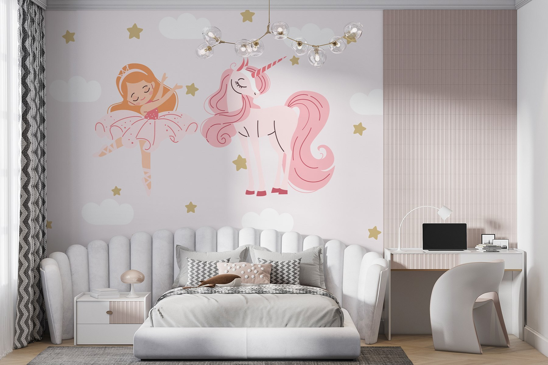 Μεταμορφώστε τον χώρο κάθε παιδιού σε ένα μαγικό βασίλειο με αυτή την υπέροχη τοιχογραφία τοίχου με μια χορεύτρια μπαλέτου και έναν γοητευτικό μονόκερο. Φανταστείτε το: τα παιδιά να στροβιλίζονται στο δωμάτιο, φανταζόμενα ότι βρίσκονται σε μια μεγάλη παράσταση, ενώ ο νέος τους φίλος μονόκερος παρακολουθεί. Τα απαλά παστέλ χρώματα και τα ευφάνταστα σύννεφα προσθέτουν μια ονειρική πινελιά, κάνοντας ακόμα και την ώρα του ύπνου να μοιάζει με περιπέτεια. Φανταστείτε μόνο τα χαχανητά και την απορία με τα μεγάλα μάτια, καθώς τα μικρά παιδιά θα μοιράζονται ιστορίες για το ρεσιτάλ χορού τους με τους μονόκερους. Δεν είναι απλώς μια τοιχογραφία, είναι η αρχή για αμέτρητα ταξίδια με φαντασία. Ποιος δεν θα ήθελε αυτού του είδους τη μαγεία στους τοίχους του;