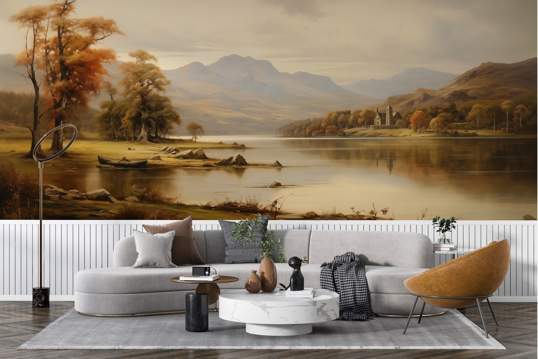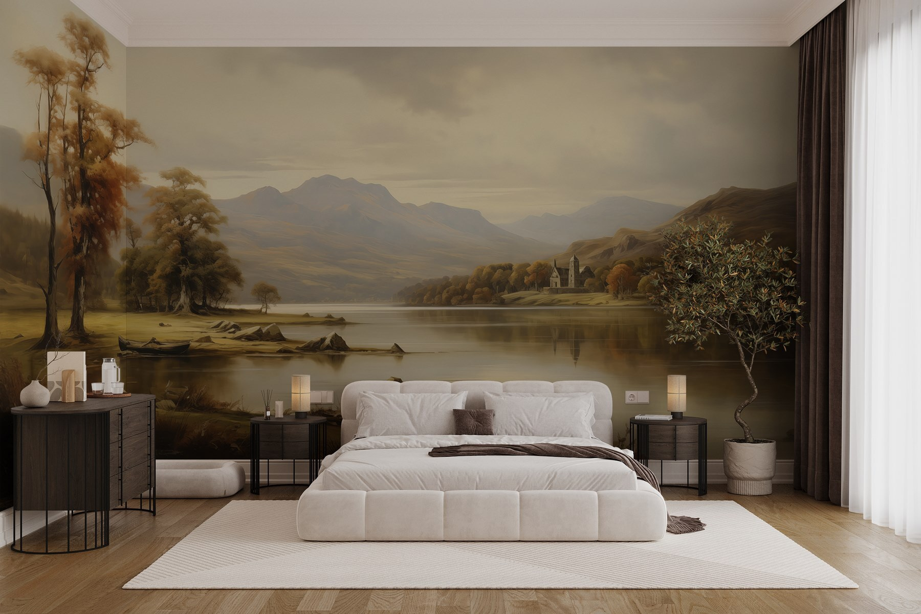 Μεταμορφώστε οποιονδήποτε χώρο σε μια γαλήνια απόδραση με αυτή την εκπληκτική τοιχογραφία τοίχου με μια γαλήνια λίμνη που περιβάλλεται από μεγαλοπρεπή δέντρα και βουνά. Φανταστείτε να ξυπνάτε μπροστά σε αυτή την ήρεμη σκηνή κάθε μέρα, νιώθοντας σαν να έχετε μπει κατευθείαν στην αγκαλιά της φύσης. Οι ζεστές αποχρώσεις προκαλούν μια αίσθηση ηρεμίας, ενώ ο απαλός κυματισμός του νερού προκαλεί μια μικρή ονειροπόληση. Είτε πρόκειται για ένα άνετο σαλόνι είτε για ένα ηρεμιστικό υπνοδωμάτιο, αυτή η τοιχογραφία ψιθυρίζει χαλάρωση. Μπορεί ακόμη και να εμπνεύσει μια αυθόρμητη πεζοπορία το Σαββατοκύριακο – απλώς να είστε έτοιμοι για τις λασπωμένες μπότες μετά!