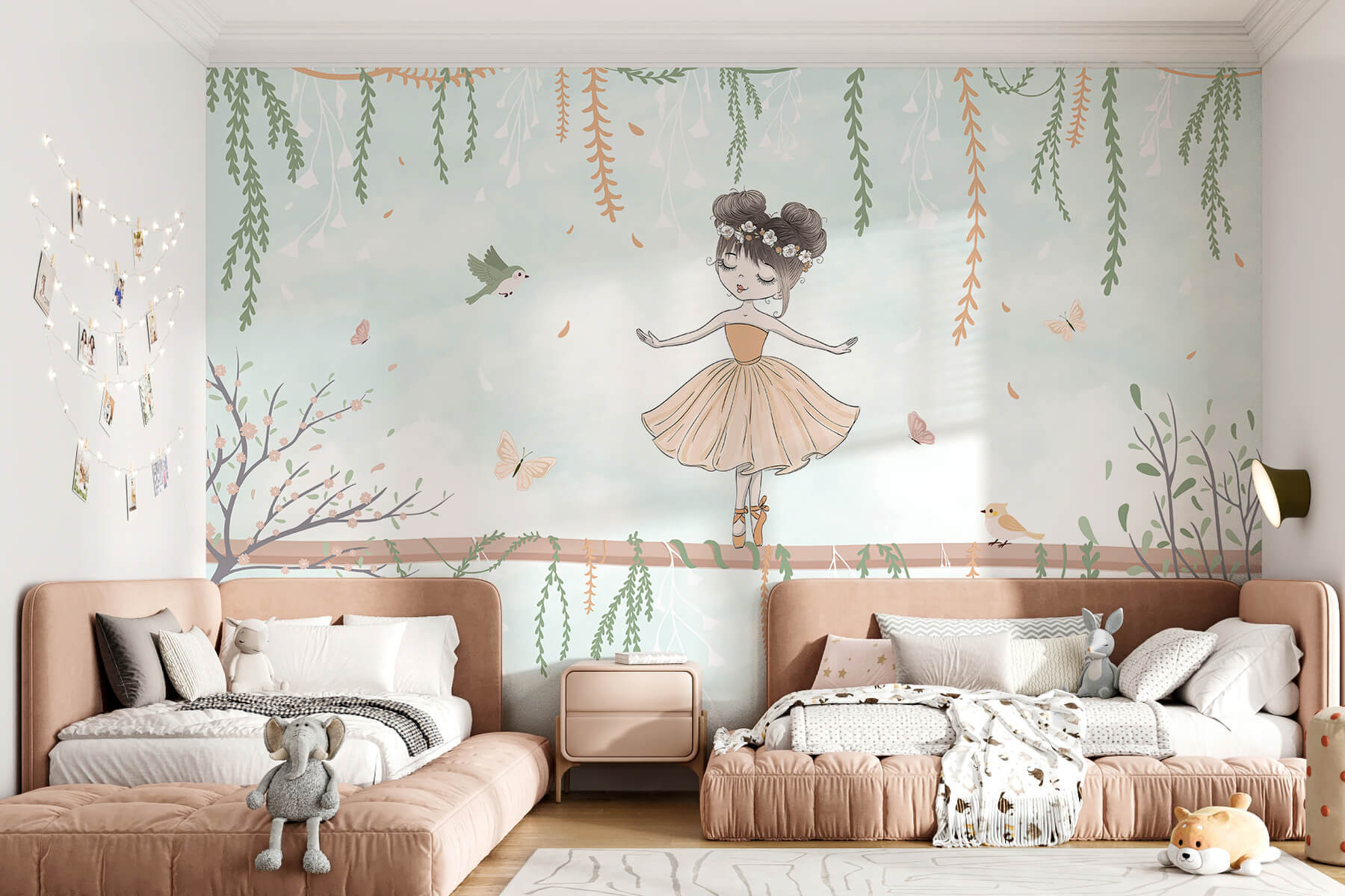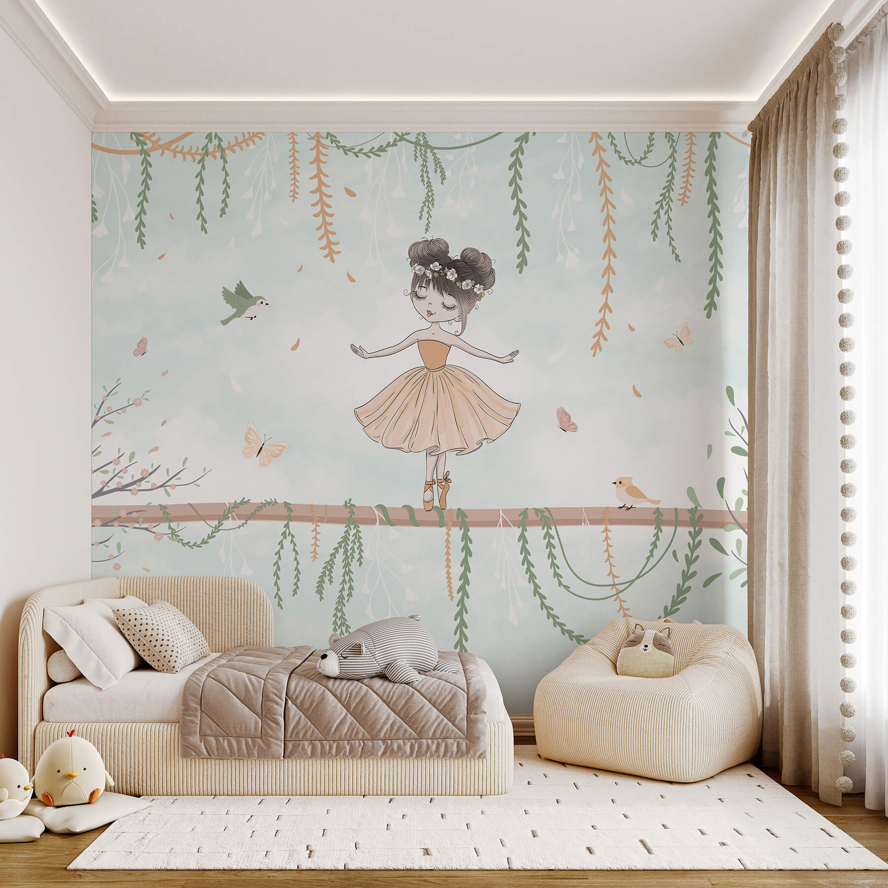 Imagine a whimsical escape right on your walls! This charming mural features a delightful girl dancing on a branch, surrounded by fluttering butterflies and curious birds. The soft pastel backdrop sets a serene tone, making any room feel like a dreamy forest retreat. It’s perfect for sparking little imaginations or simply adding a touch of magic to a nursery or playroom. Picture storytime turning into an adventure as kids gaze at this enchanting scene, completely lost in its sweetness. Seriously, who wouldn’t want to twirl happily along with her? A dash of joy for walls that call for a smile!