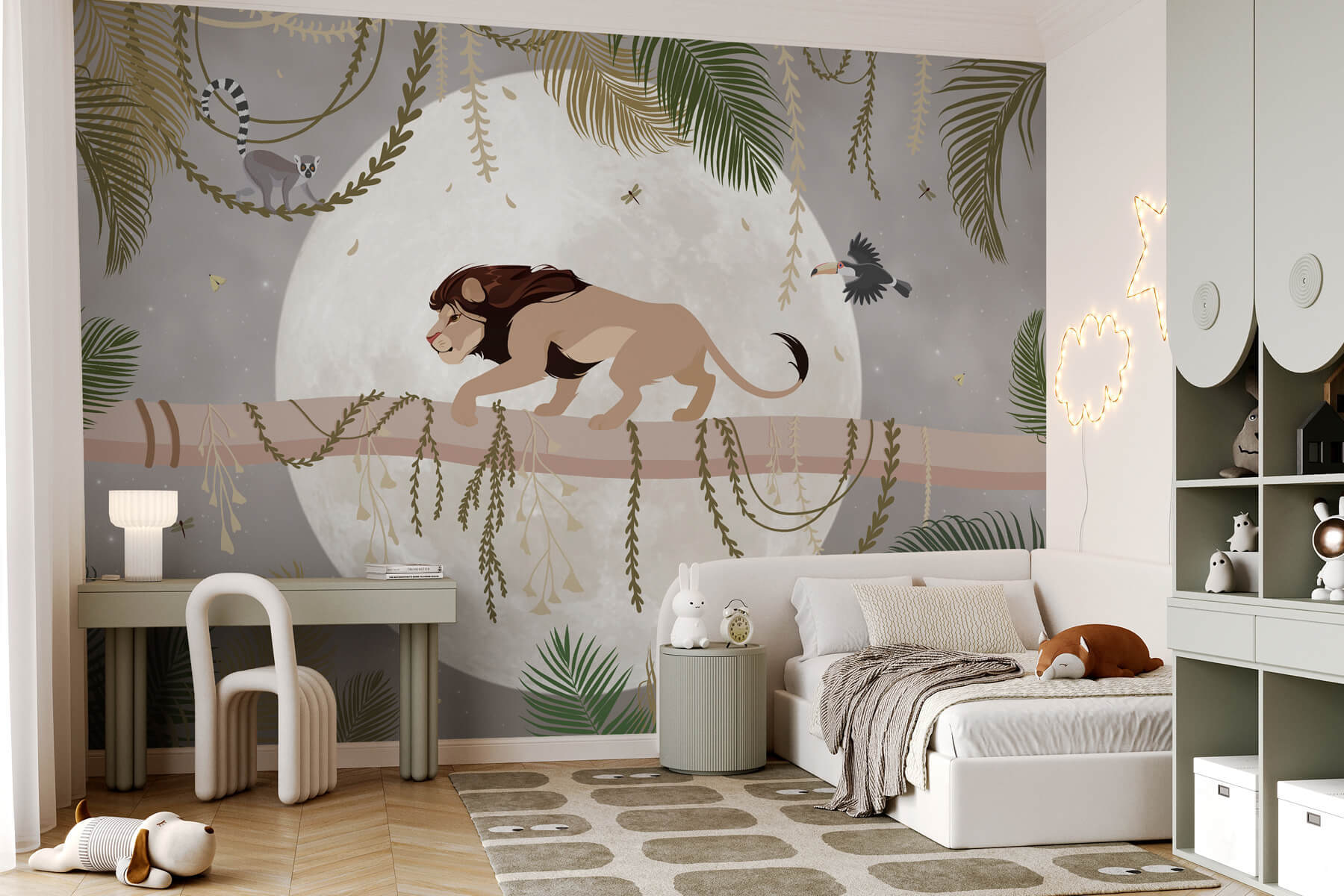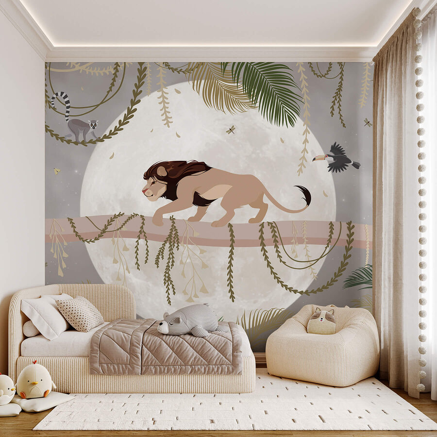Σας παρουσιάζουμε μια τοιχογραφία που αποπνέει άγρια γοητεία: το «Λιοντάρι σε κλαδί δέντρου». Φανταστείτε αυτό το μεγαλοπρεπές πλάσμα να περπατά με αυτοπεποίθηση πάνω σε ένα κλαδί, πλαισιωμένο από ταλαντευόμενα φύλλα και ένα ονειρικό φεγγάρι. Είναι σαν να φέρνετε ένα κομμάτι των τροπικών στο σαλόνι σας. Κάθε ματιά προσφέρει μια δόση περιπέτειας, δεν νομίζετε;