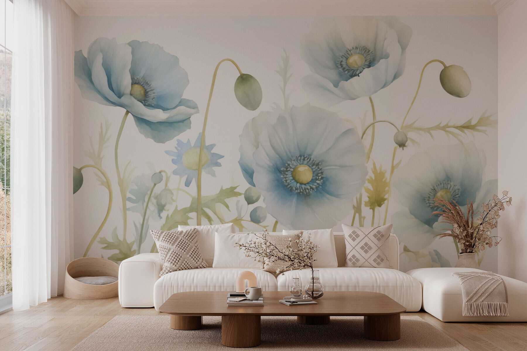 Transform a dull wall into a peaceful oasis with the “Delicate Blooms in Soft Pastel Hues” mural. Imagine walking into a room where gentle watercolor flowers dance softly on the wall, their serene colors whispering sweet nothings to your soul.