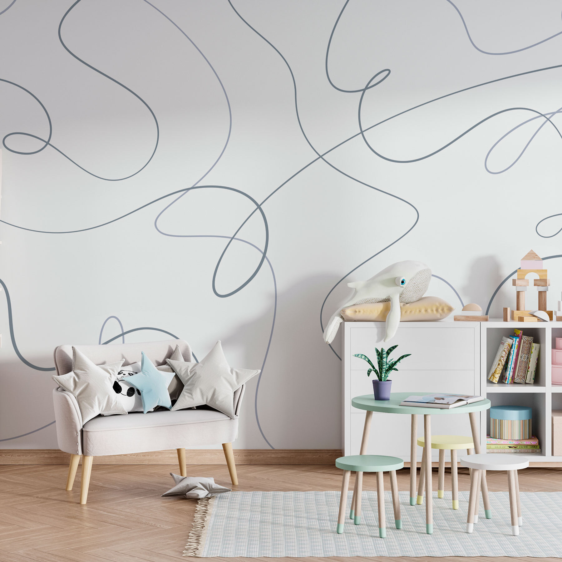 Φανταστείτε να μπαίνετε σε ένα δωμάτιο που σας δίνει την αίσθηση μιας ανάσας φρέσκου αέρα. Αυτή είναι η μαγεία αυτής της τοιχογραφίας — «Τοιχογραφίες με λευκό φόντο και μπλε γραμμές». Είναι σαν ένας παιχνιδιάρικος χορός στροβιλισμένων γραμμών, που φωτίζει αβίαστα κάθε χώρο. Ιδανικό για εκείνες τις μέρες που η ζωή φαίνεται λίγο πολύ σοβαρή, αυτό το σχέδιο προσθέτει μια πινελιά χιούμορ με τις ιδιόμορφες στροφές και ανατροπές του. Είτε βρίσκεται σε μια ζεστή γωνιά ανάγνωσης, σε μια ζωντανή κουζίνα ή στο γραφείο του σπιτιού σας που χρειάζεται έμπνευση, προσκαλεί τη φαντασία να περιπλανηθεί ελεύθερα. Φανταστείτε να κάθεστε αναπαυτικά, να πίνετε τον καφέ σας και να αφήνετε τις σκέψεις σας να περιπλανηθούν κατά μήκος αυτών των γραμμών — σοβαρά, θα μπορούσε να σας προκαλέσει μια-δυο ονειροπολήσεις. Όλα έχουν να κάνουν με την ελαφρότητα και τη δημιουργικότητα, κάνοντας τους τοίχους σας όχι μόνο φόντο, αλλά καμβά για χαρά.