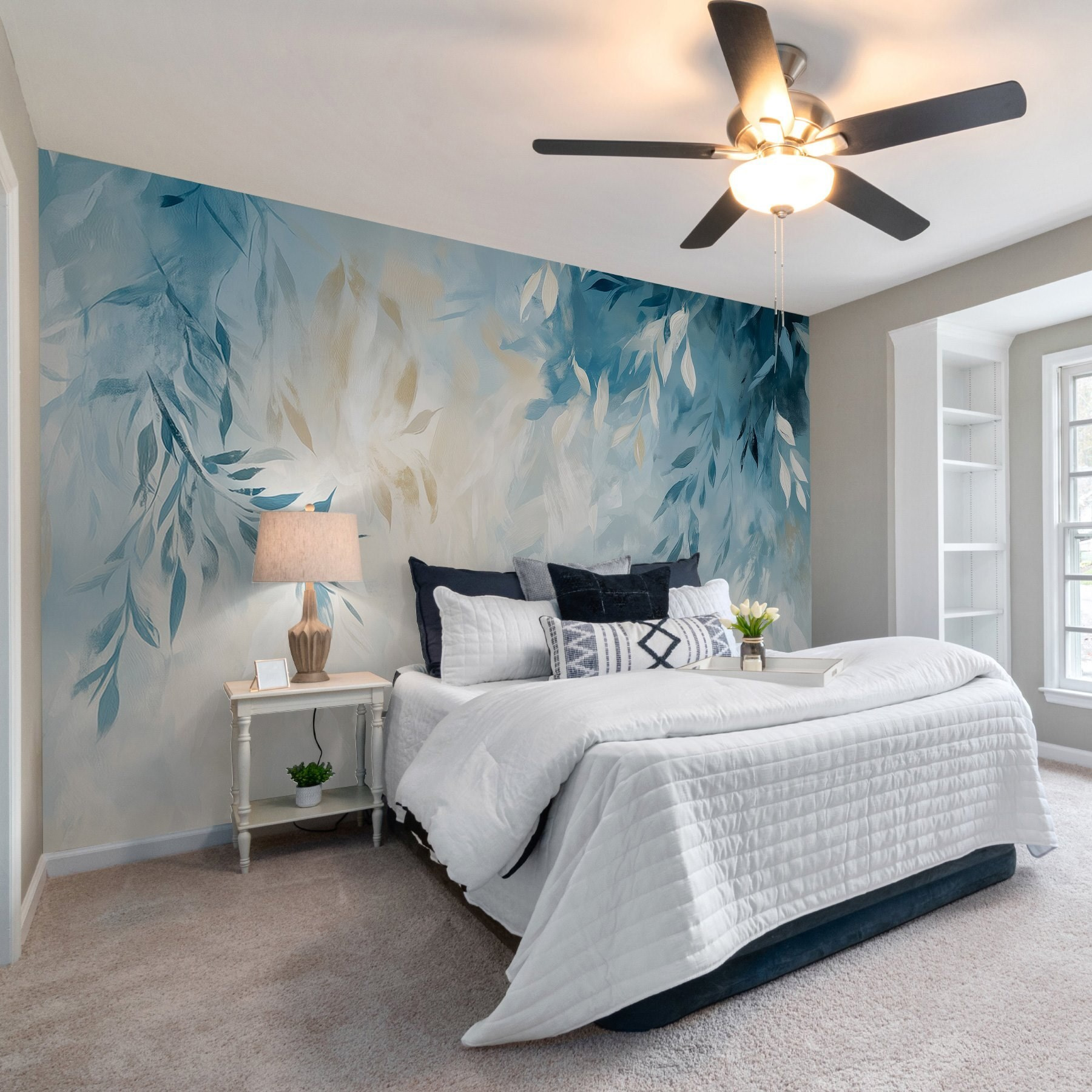 Ο μετασχηματισμός ενός χώρου μπορεί να είναι τόσο εύκολος όσο το να κρεμάσετε αυτή την υπέροχη τοιχογραφία με ένα ηρεμιστικό μπλε και λευκό φόντο που κοσμείται με λεπτά φύλλα. Είναι σαν μια ανάσα φρέσκου αέρα ακριβώς στο σαλόνι ή το υπνοδωμάτιό σας. Φανταστείτε να πίνετε τον καφέ σας, ενώ το φως του ήλιου φιλτράρει, ρίχνοντας απαλές σκιές και κάνοντας τα φύλλα να χορεύουν. Είναι ιδανικό για τη δημιουργία μιας γαλήνιας ατμόσφαιρας, προσκαλώντας σε χαλάρωση και ίσως ακόμη και για να εμπνεύσετε ονειροπολήσεις για τη φύση. Έχετε έναν άδειο τοίχο; Αυτή η τοιχογραφία τον γεμίζει με κομψότητα και μια πινελιά ιδιοτροπίας, μετατρέποντας κάθε βαρετό χώρο σε ένα ζεστό καταφύγιο. Ποιος ήξερε ότι η διακόσμηση θα μπορούσε να είναι τόσο αναζωογονητική;