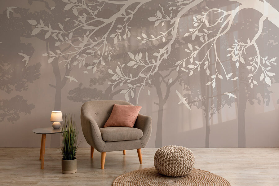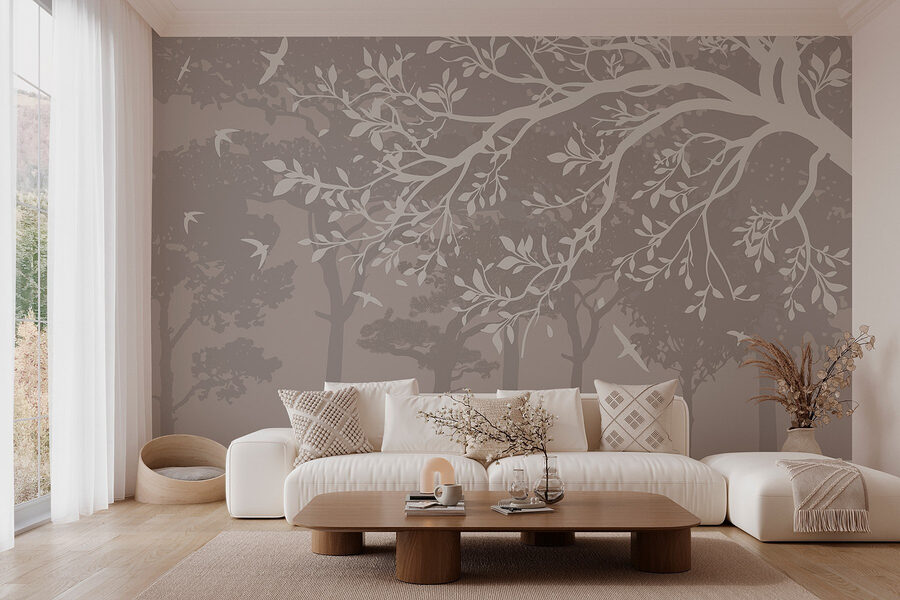 Μεταμορφώστε τον χώρο σας με αυτή την εκπληκτική τοιχογραφία που απεικονίζει μια γαλήνια ομάδα δέντρων, με πουλιά που πετούν στον αέρα. Είναι σαν να μπαίνετε σε ένα ήσυχο δάσος, χωρίς τα έντομα και την υγρασία. Φανταστείτε ένα άνετο σαλόνι ή ένα χαλαρωτικό υπνοδωμάτιο όπου αυτό το έργο φέρνει μια πνοή φύσης στο εσωτερικό του σπιτιού σας. Τα κομψά κλαδιά των δέντρων χορεύουν στον τοίχο σας, δημιουργώντας μια ατμόσφαιρα ηρεμίας που σχεδόν σας κάνει να ξεχάσετε το σωρό από άπλυτα ρούχα στη γωνία. Είτε πρόκειται για μια δημιουργική γωνιά είτε για μια γωνιά ανάγνωσης, αυτή η ταπετσαρία τυλίγει αβίαστα κάθε δωμάτιο με ζεστασιά και γοητεία. Επιπλέον, είναι ένα άμεσο θέμα συζήτησης — ποιος δεν θα ήθελε να συζητήσει για την ατμόσφαιρα της αστικής ζούγκλας; Μια πινελιά φύσης δεν έβλαψε ποτέ κανέναν, σωστά;