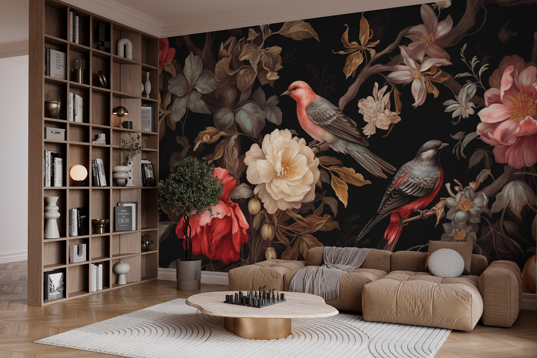 Φανταστείτε να μπαίνετε σε ένα δωμάτιο όπου η ομορφιά της φύσης χορεύει στους τοίχους. Αυτή η τοιχογραφία, με τα γοητευτικά πουλιά που κάθονται ανάμεσα σε πλούσια λουλούδια, προσθέτει μια πινελιά ιδιοτροπίας και απόλαυσης. Τα ζωηρά λουλούδια και τα πλούσια χρώματα προσκαλούν ζεστασιά, κάνοντας κάθε χώρο να αισθάνεται ζωντανός. Φανταστείτε ένα άνετο απόγευμα, πίνοντας τσάι, ενώ το φως του ήλιου φιλτράρει, ρίχνοντας παιχνιδιάρικες σκιές. Είναι σαν να φέρνετε έναν μυστικό κήπο μέσα στο σπίτι – ιδανικό για όσους αγαπούν τη μοναδική διακόσμηση. Είτε πρόκειται για ένα σαλόνι είτε για μια γωνιά ανάγνωσης, αυτή η τοιχογραφία ψιθυρίζει ιστορίες από την κομψότητα της φύσης, μετατρέποντας αβίαστα τους τοίχους σας σε έναν καμβά χαράς.