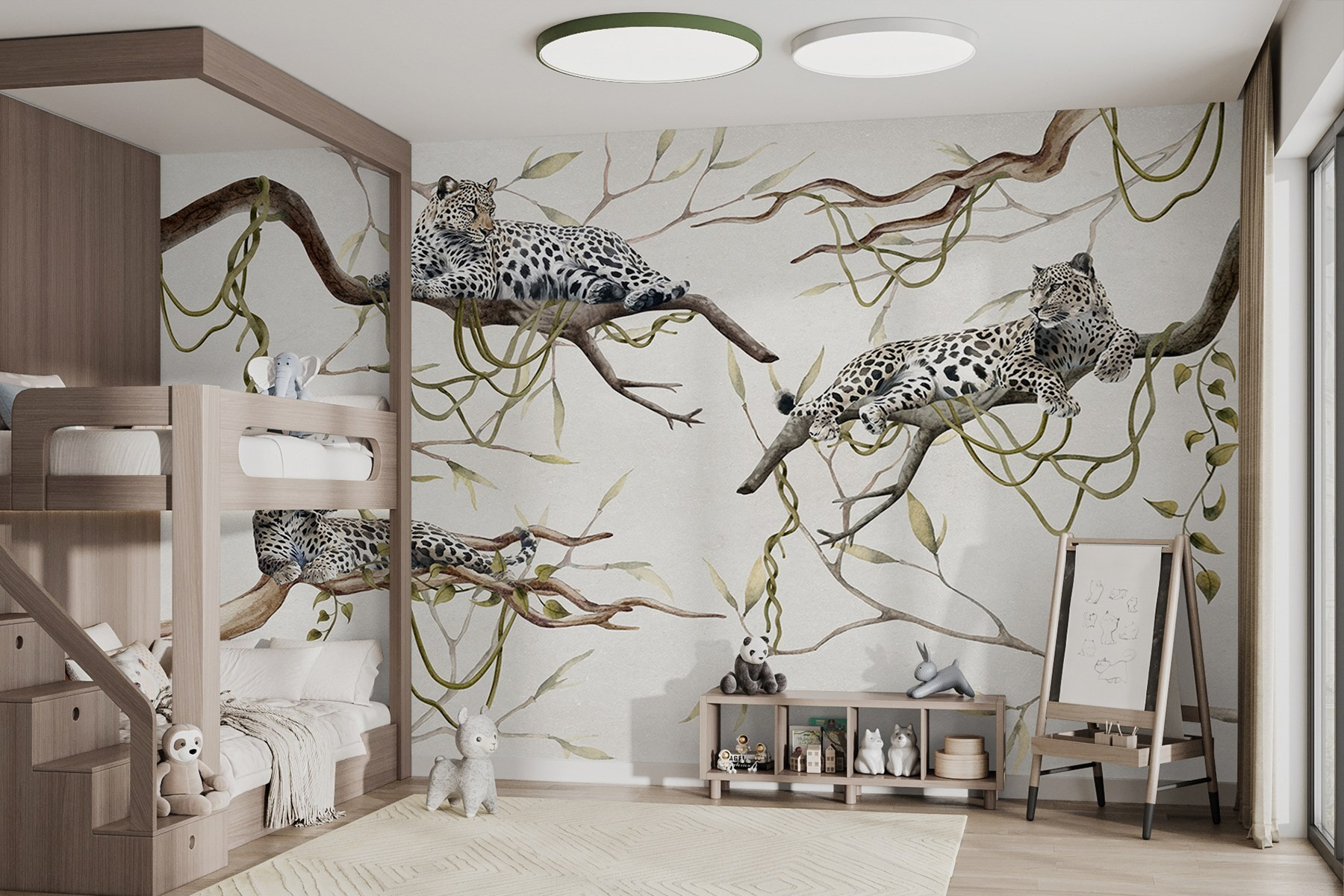 Μεταμορφώστε τον χώρο σας σε μια άγρια όαση με αυτή την εκπληκτική ταπετσαρία τοίχου που απεικονίζει μια ομάδα λεοπαρδάλεων που χαλαρώνουν πάνω σε κλαδιά. Φανταστείτε να μπαίνετε στο δωμάτιο και να νιώθετε την ουσία της φύσης να σας περιβάλλει – αυτά τα απλά μοτίβα με κηλίδες και κομψές πόζες κλέβουν την παράσταση. Ιδανικό για εκείνο το σημείο που χρειάζεται λίγο πνεύμα, ή ίσως για να προκαλέσετε ζήλια στην επόμενη συνάντηση του βιβλιοκλαμπ σας. Είναι σαν να έχετε ένα κομμάτι της ζούγκλας στο σπίτι σας, χωρίς τα κουνούπια. Επιπλέον, ποιος δεν θα ήθελε να ξυπνάει με τέτοια μεγαλοπρεπή πλάσματα; Όλα έχουν να κάνουν με την αρμονική ατμόσφαιρα, σωστά;