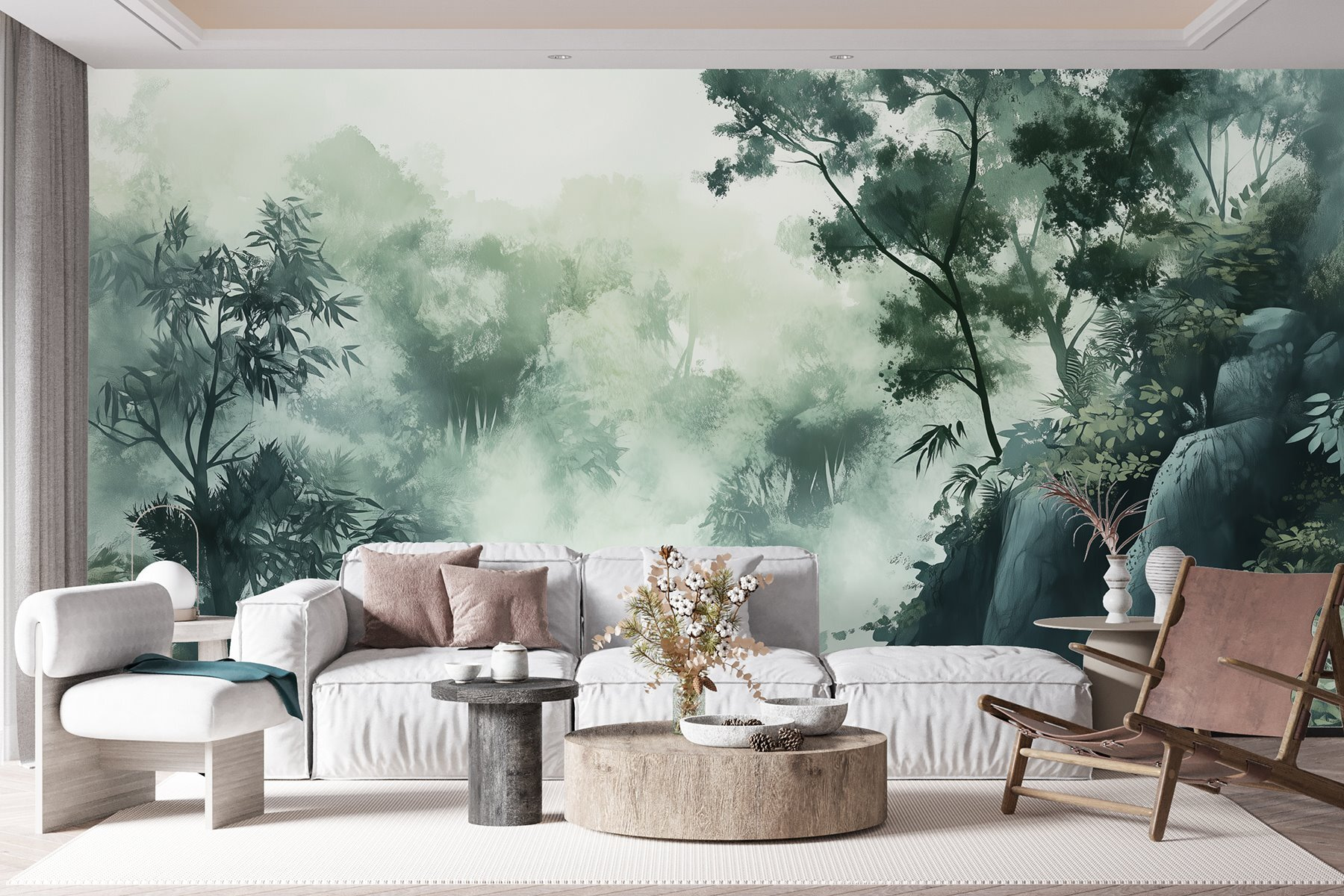 Ταπετσαρίες Ομιχλώδες δάσος με δέντρα και βράχια (Κωδικός προϊόντος: w03149)