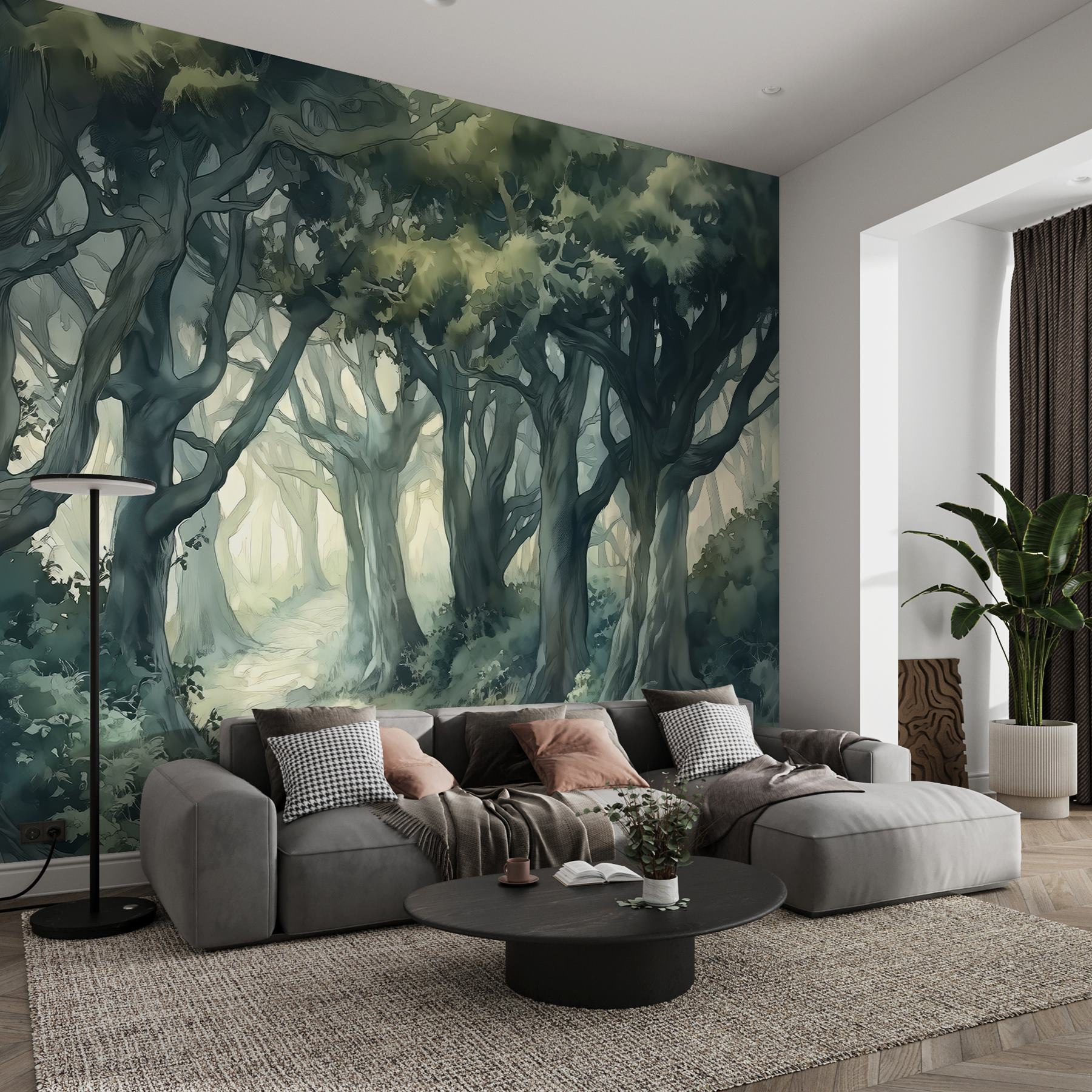 Οι απαλές αποχρώσεις και τα λεπτομερή δέντρα δημιουργούν μια γαλήνια ατμόσφαιρα, καθιστώντας το ιδανικό για μια ζεστή γωνιά ανάγνωσης ή ένα γαλήνιο υπνοδωμάτιο. Φανταστείτε να βολευτείτε με ένα φλιτζάνι τσάι, με το ηρεμιστικό σκηνικό να σας τυλίγει σαν μια ζεστή αγκαλιά. Και ποιος είπε ότι η φύση δεν μπορεί να έρθει στο σπίτι; Προσθέστε αυτή την τοιχογραφία και ξαφνικά, η ονειροπόληση για περιπέτειες στο δάσος γίνεται καθημερινή υπόθεση.