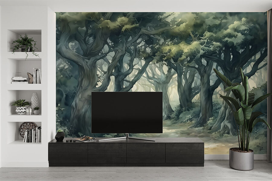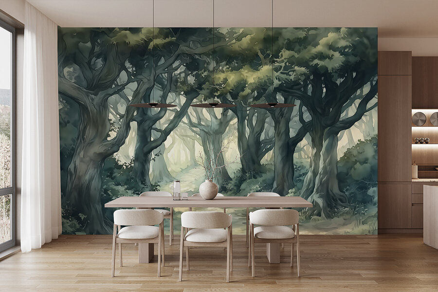 Οι απαλές αποχρώσεις και τα λεπτομερή δέντρα δημιουργούν μια γαλήνια ατμόσφαιρα, καθιστώντας το ιδανικό για μια ζεστή γωνιά ανάγνωσης ή ένα γαλήνιο υπνοδωμάτιο. Φανταστείτε να βολευτείτε με ένα φλιτζάνι τσάι, με το ηρεμιστικό σκηνικό να σας τυλίγει σαν μια ζεστή αγκαλιά. Και ποιος είπε ότι η φύση δεν μπορεί να έρθει στο σπίτι; Προσθέστε αυτή την τοιχογραφία και ξαφνικά, η ονειροπόληση για περιπέτειες στο δάσος γίνεται καθημερινή υπόθεση.