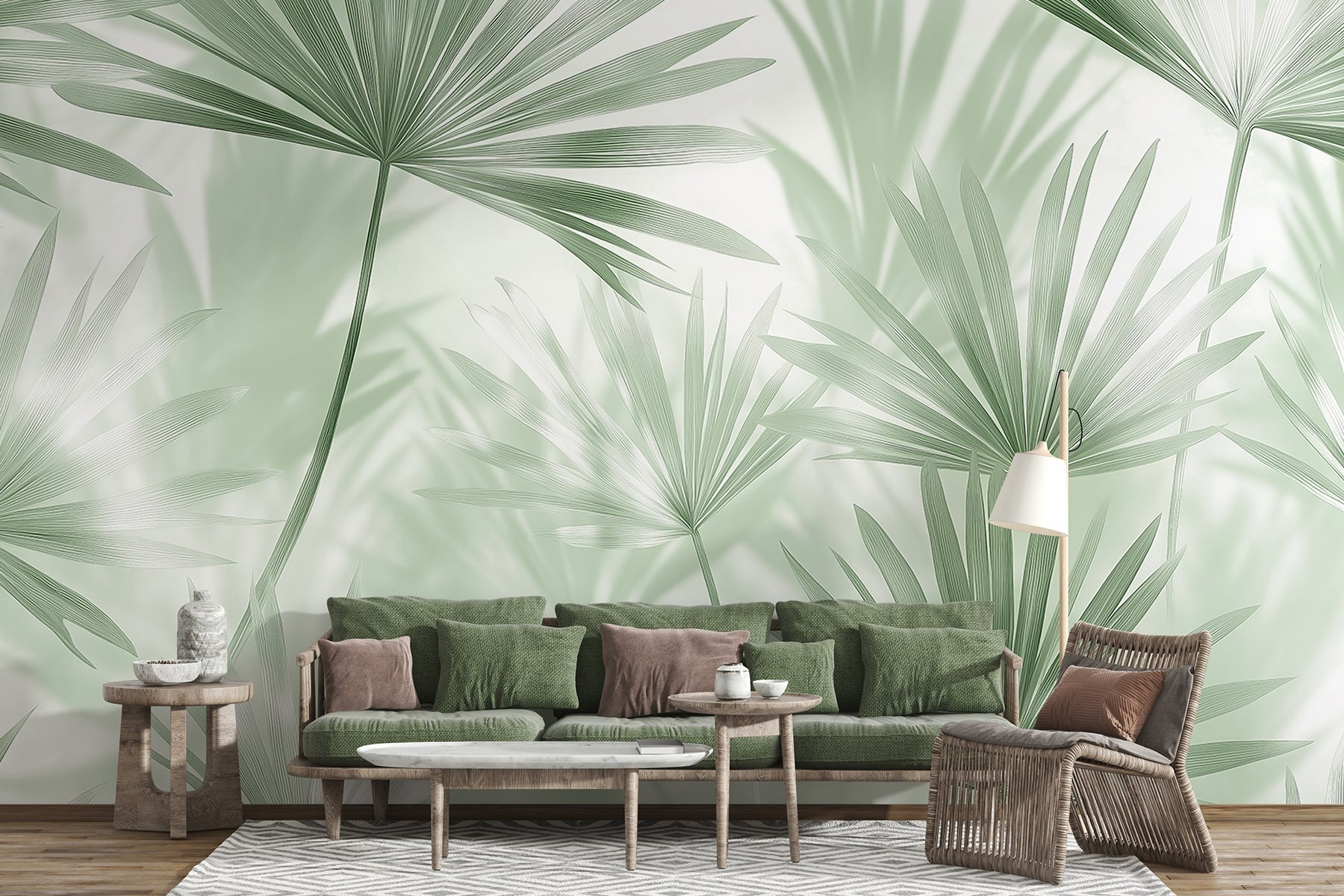 Μεταμορφώστε οποιονδήποτε χώρο σε μια γαλήνια όαση με αυτή την ονειρική ταπετσαρία τοίχου, “Απαλοί χρωματισμοί γης και λεπτό φύλλωμα”. Φανταστείτε να περιβάλλεστε καθημερινά από χαλαρωτικά πράσινα χρώματα και απαλές υφές — ιδανικό για εκείνες τις στιγμές που χρειάζεστε μια μικρή απόδραση ή ίσως ακόμη και έμπνευση για το επόμενο DIY πρότζεκτ σας. Τα λεπτά φύλλα φοίνικα χορεύουν μαζί, δημιουργώντας την αίσθηση ότι ένα απαλό αεράκι φυσάει στο δωμάτιό σας, χωρίς τα περιστασιακά έντομα που πάντα βρίσκουν τρόπο να μπουν μέσα. Είναι επίσης ευχάριστο στο μάτι — χωρίς έντονα χρώματα ή χαοτικά σχέδια. Μόνο μια ζεστή αγκαλιά της φύσης που φέρνει ήρεμες δονήσεις, κάνοντας δύσκολο να μην χαμογελάσετε καθώς πίνετε τον καφέ σας ή χαλαρώνετε μετά από μια κουραστική μέρα. Ετοιμαστείτε να μετατρέψετε τον τοίχο σας σε ένα θέμα συζήτησης που συνδυάζει την ομορφιά με μια πινελιά τροπικής ηρεμίας!