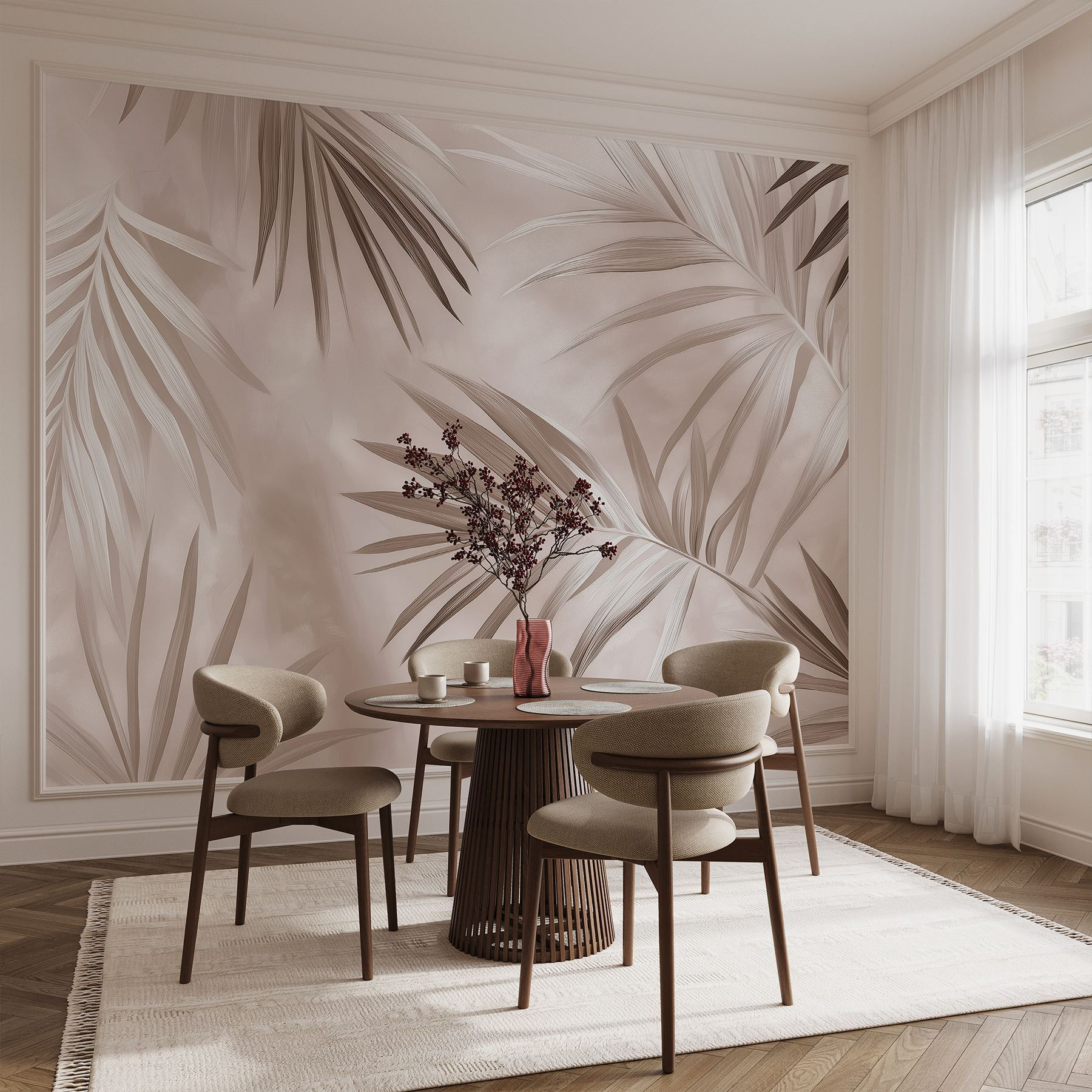 Φανταστείτε να μπαίνετε σε ένα άνετο τροπικό καταφύγιο κάθε φορά που μπαίνετε στο χώρο σας. Αυτή η τοιχογραφία τοίχου, με χαριτωμένα φύλλα σε απαλό φόντο, φέρνει αυτή την ατμόσφαιρα κατευθείαν στο σπίτι σας. Σκεφτείτε τους απαλούς ψιθύρους της φύσης με μια πινελιά γαλήνης. Είναι ιδανική για να ονειρεύεστε ηλιόλουστες διακοπές ενώ πίνετε τον πρωινό σας καφέ. Οι φίλοι μπορεί να σταματήσουν και να ρωτήσουν: “Μόλις επιστρέψατε από μια απόδραση;”. Εσείς απλά θα χαμογελάτε, γνωρίζοντας ότι η μικρή σας όαση βρίσκεται ακριβώς πίσω σας. Είτε πρόκειται για ένα σαλόνι, ένα υπνοδωμάτιο ή ακόμα και για εκείνο το τμήμα που δεν είστε σίγουροι τι να κάνετε, αυτή η τοιχογραφία προσθέτει μια δροσερή, αναζωογονητική πινελιά. Επιπλέον, είναι έναυσμα για συζήτηση – γιατί ποιος δεν θέλει να μιλάει για φύλλα φοίνικα;