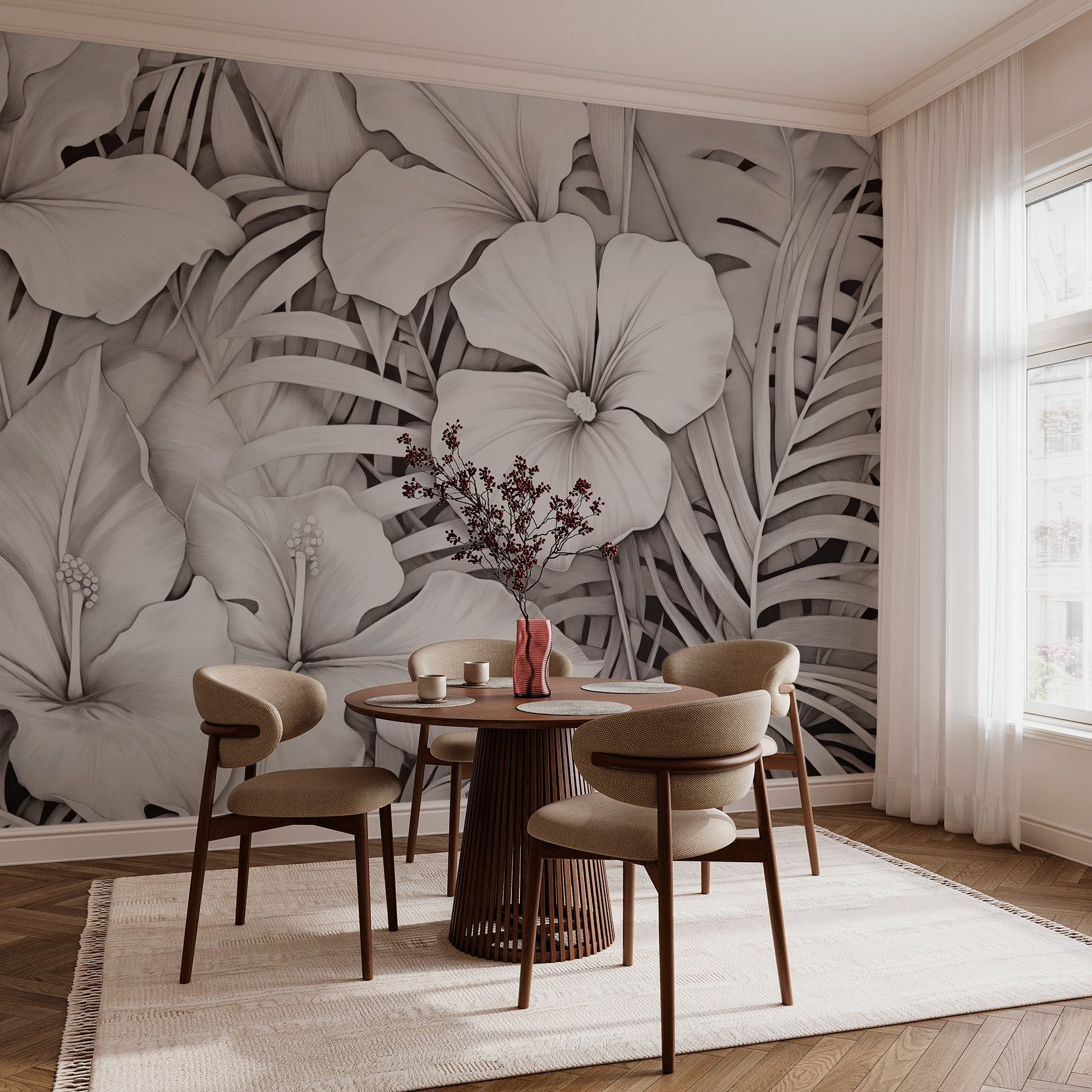 Μεταμορφώστε οποιοδήποτε δωμάτιο με αυτή την εκπληκτική ταπετσαρία τοίχου, με ένα κομψό floral σχέδιο σε χαλαρωτικούς μονόχρωμους τόνους. Φανταστείτε να μπαίνετε στο χώρο σας και να σας υποδέχονται πλούσια φύλλα και λουλούδια – είναι σαν να έχετε μια μίνι τροπική απόδραση στο σπίτι σας. Ιδανική για τη δημιουργία μιας ήρεμης ατμόσφαιρας, αυτή η ταπετσαρία συνδυάζει αβίαστα την ομορφιά της φύσης με το μοντέρνο στυλ.