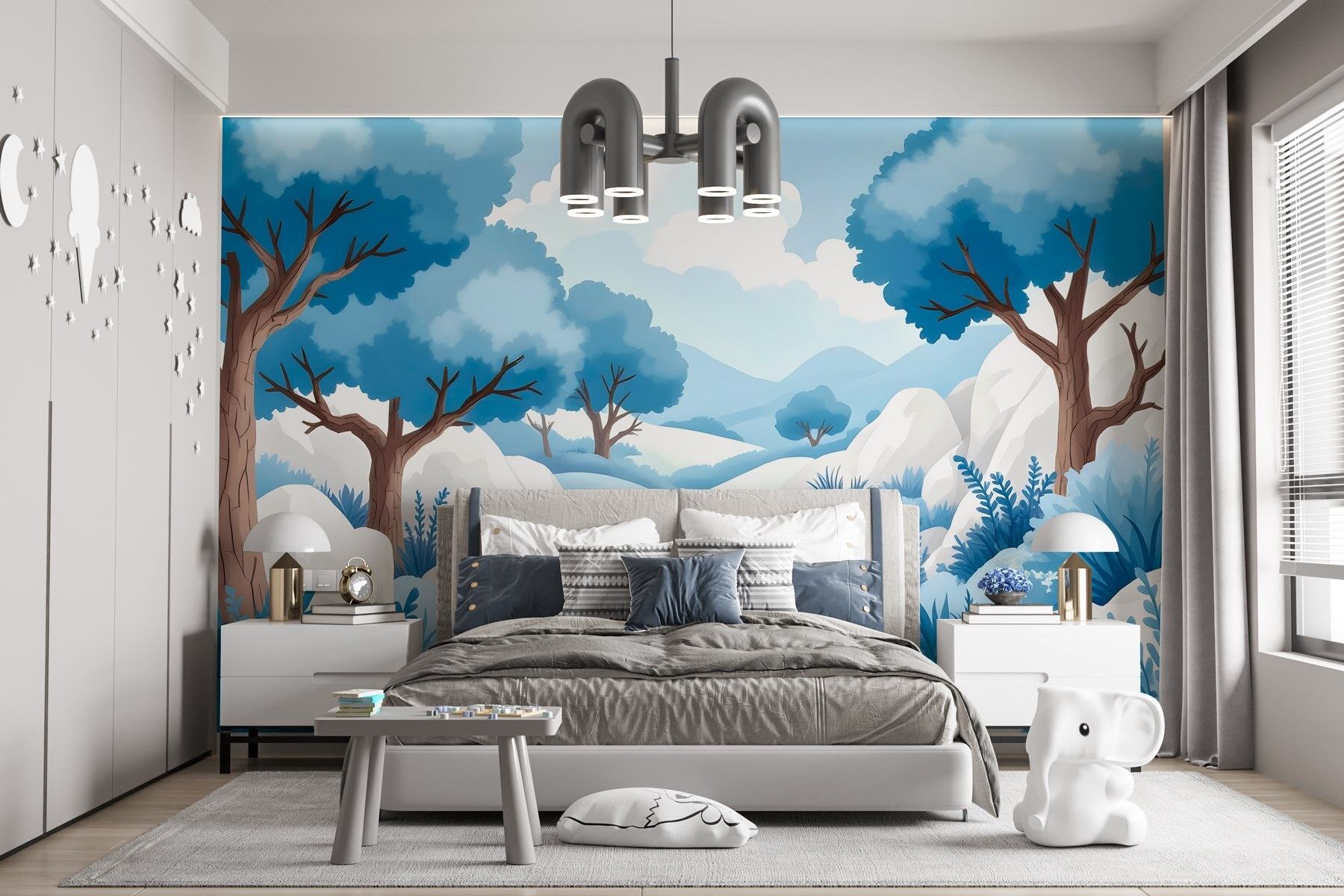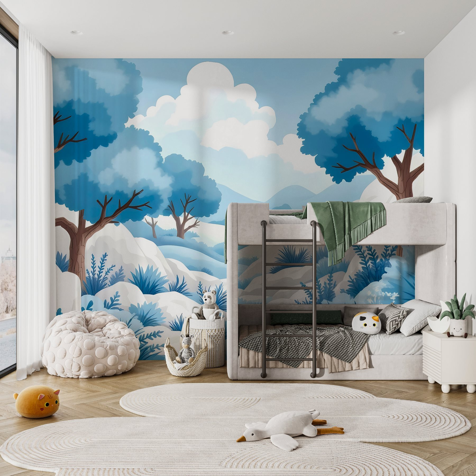 Transform your walls into a dreamy escape with this “Snowy Landscape” mural. Imagine waking up to crisp blues and tranquil whites—like a gentle snow blanket wrapped around your room. The trees, with their quirky branches, seem to whisper secrets of winter days long past. It’s like stepping into a peaceful painting, perfect for cozy corners or upbeat living spaces. Picture someone sipping tea while basking in the serene vibes this mural brings. It’s not just decor, it’s a mini-vacation every time you glance around. Ideal for those who adore nature and whimsy!