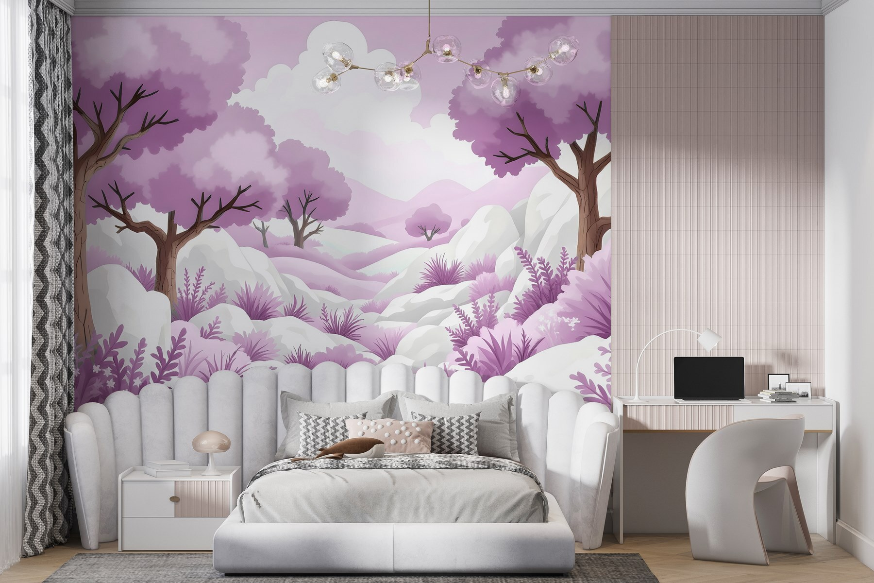Μεταμορφώστε οποιοδήποτε δωμάτιο σε ένα ονειρικό καταφύγιο με αυτή τη μαγευτική ταπετσαρία τοίχου, «Τοπίο με δέντρα και χιόνι». Φανταστείτε να μπαίνετε σε ένα φανταστικό δάσος, όπου απαλά δέντρα λεβάντας λικνίζονται απαλά, περιτριγυρισμένα από αφράτο χιόνι και ευαίσθητα φυτά. Είναι σαν ένας μαγικός κόσμος όπου ο χειμώνας συνυπάρχει αρμονικά με την άνοιξη!
