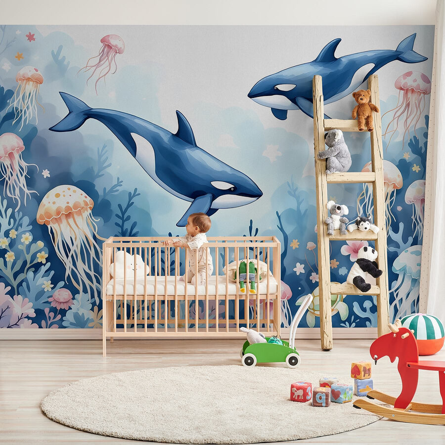 Μεταμορφώστε τον χώρο σας σε ένα υποβρύχιο παραμύθι με αυτή τη μαγευτική ταπετσαρία τοίχου που απεικονίζει φάλαινες και μια παιχνιδιάρικη χελώνα που παίζει στα ζωντανά νερά του ωκεανού. Φανταστείτε να μπαίνετε σε ένα δωμάτιο όπου οι μέδουσες επιπλέουν νωχελικά και τα πολύχρωμα κοράλλια λικνίζονται σαν να χορεύουν. Είναι σαν να έχετε το δικό σας κομμάτι της θάλασσας στο σπίτι σας! Ιδανική για παραθαλάσσια ατμόσφαιρα, αυτή η ταπετσαρία θα σας κάνει να ονειρεύεστε τις μέρες στην παραλία και την θαλασσινή αύρα. Ποιος δεν θα χαμογελούσε βλέποντας τις χελώνες να κάνουν τις δουλειές τους σε μια θάλασσα γαλήνης; Αυτό το έργο τέχνης δεν είναι απλώς διακόσμηση, είναι μια πρόσκληση για απόδραση και εξερεύνηση — χωρίς να χρειάζεστε εξοπλισμό κατάδυσης!