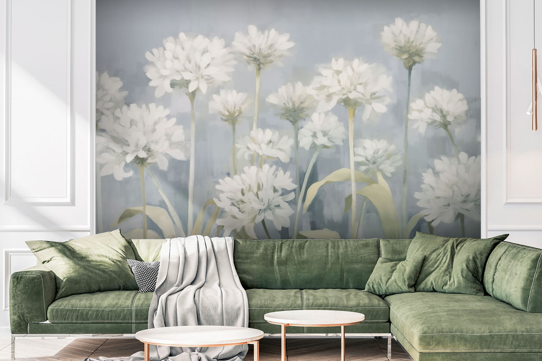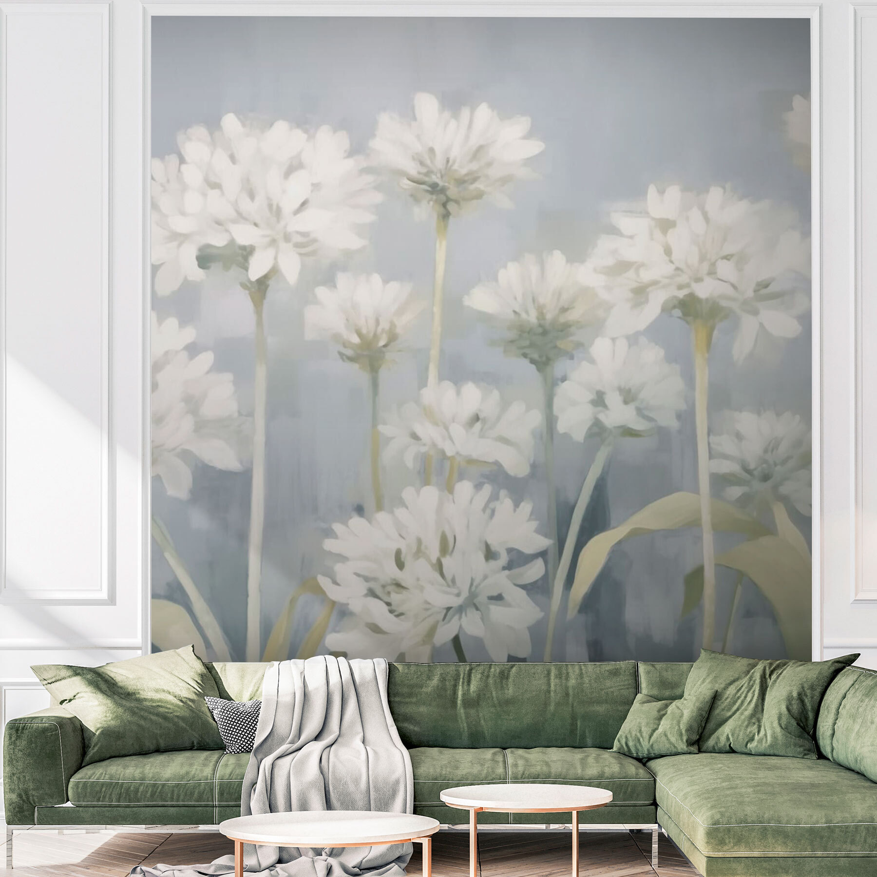 Μεταμορφώστε οποιονδήποτε χώρο με την απαλή πινελιά της «Τοιχογραφίας με λευκά λουλούδια». Φανταστείτε το εξής: μπαίνετε στο δωμάτιό σας και voilà! Σας υποδέχεται ένας γαλήνιος κήπος με απαλά, υδατογραφικά χρώματα. Κάθε λουλούδι χορεύει ελαφρά σε ένα χαλαρωτικό φόντο, φέρνοντας μια πνοή φύσης στο εσωτερικό του σπιτιού. Είναι σαν να έχετε άνοιξη όλο το χρόνο, χωρίς τα φτερνίσματα. Όποιος το δει δεν μπορεί παρά να χαμογελάσει. Ιδανικό για ζεστές γωνιές, για να φωτίσει μια γωνιά ανάγνωσης ή ακόμα και για να γίνει το επίκεντρο του σαλονιού, αυτό το τοιχογραφικό είναι ο νέος καλύτερος φίλος του σπιτιού σας. Μην εκπλαγείτε αν αρχίσετε να μιλάτε με τα λουλούδια!